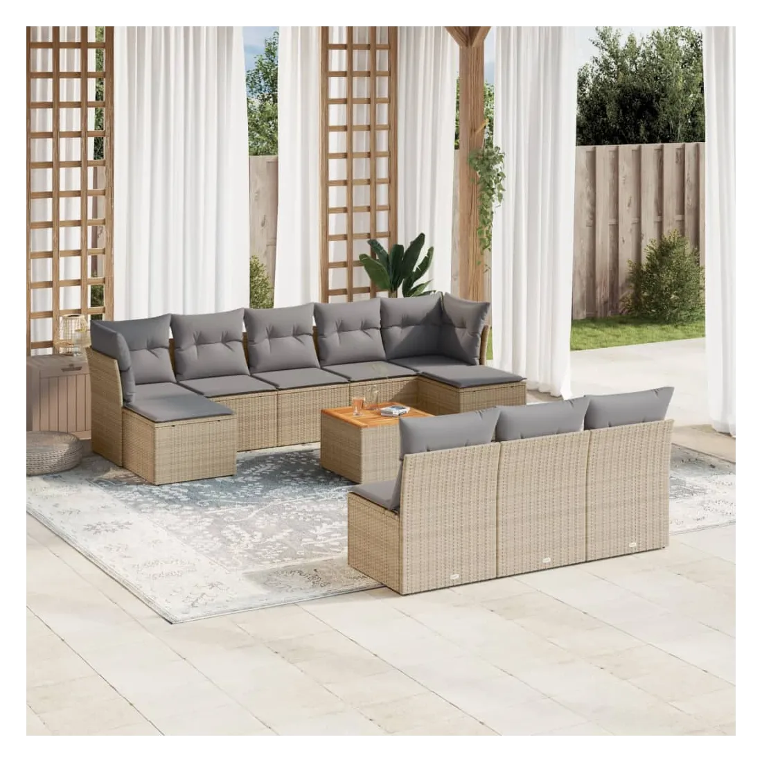 Cet ensemble de canapés de jardin est le complément parfait de votre arrière-cour, terrasse ou patio, offrant un espace confortable et accueillant pour discuter avec la famille et les amis ou simplement se détendre et profiter de l'extérieur. Matériau durable : la résine tressée, également connue sous le nom de poly rotin, est un matériau synthétique solide et nécessitant peu d'entretien qui ressemble au rotin naturel. Il est léger, facile à nettoyer et couramment utilisé pour les meubles d'extérieur en raison de sa durabilité et de ses propriétés de résistance aux intempéries.Fonction de rangement avec sac résistant à l'eau : chaque siège de jardin dispose d'un espace de rangement sous l'assise, complété par un sac résistant à l'eau pour ranger les coussins, les jouets et d'autres objets. Les sacs intérieurs sont dotés d'un couvercle et peuvent être solidement fixés aux sièges à l'aide de bandes auto-agrippantes pour plus de stabilité.Dessus stable et facile à nettoyer : cette table de jardin a un dessus en bois d'acacia robuste, durable et facile à nettoyer avec un chiffon humide.Pouf polyvalent : le tabouret est polyvalent, servant de repose-pieds confortable lorsque vous vous prélassez sur le canapé ou de siège supplémentaire dans votre jardin.Conception modulaire : cet ensemble de meubles d'extérieur a une conception modulaire, ce qui le rend complètement flexible et facile à déplacer, afin que vous puissiez créer un agencement de meubles d'extérieur personnalisé. Bon à savoir :Pour que vos meubles d'extérieur restent beaux, nous vous recommandons de les protéger avec une housse imperméable.