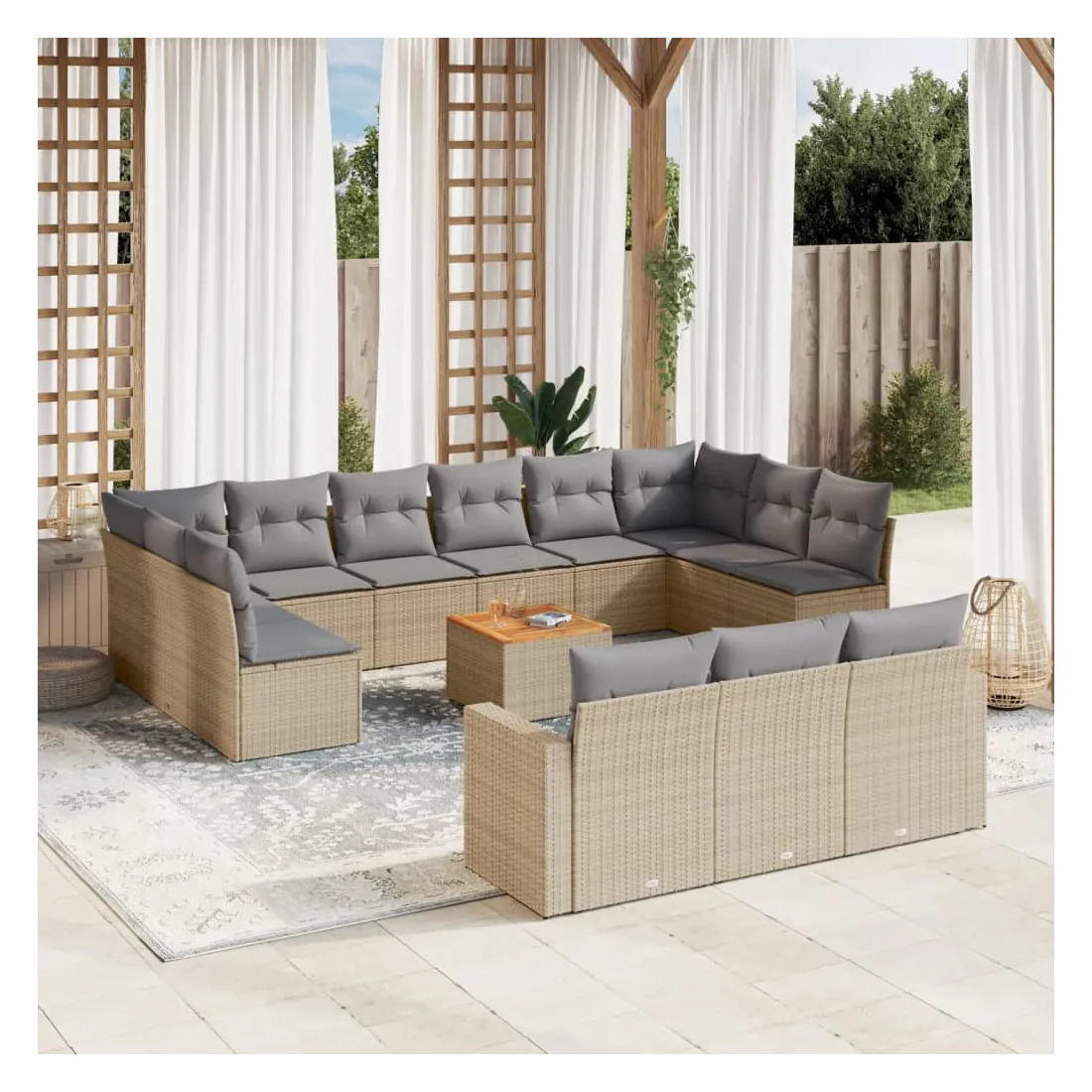 Cet ensemble de canapés de jardin est le complément parfait de votre arrière-cour, terrasse ou patio, offrant un espace confortable et accueillant pour discuter avec la famille et les amis ou simplement se détendre et profiter de l'extérieur. Matériau durable : la résine tressée, également connue sous le nom de poly rotin, est un matériau synthétique solide et nécessitant peu d'entretien qui ressemble au rotin naturel. Il est léger, facile à nettoyer et couramment utilisé pour les meubles d'extérieur en raison de sa durabilité et de ses propriétés de résistance aux intempéries.Fonction de rangement avec sac résistant à l'eau : chaque siège de jardin dispose d'un espace de rangement sous l'assise, complété par un sac résistant à l'eau pour ranger les coussins, les jouets et d'autres objets. Les sacs intérieurs sont dotés d'un couvercle et peuvent être solidement fixés aux sièges à l'aide de bandes auto-agrippantes pour plus de stabilité.Dessus stable et facile à nettoyer : cette table de jardin a un dessus en bois d'acacia robuste, durable et facile à nettoyer avec un chiffon humide.Housse amovible et lavable : ces coussins de siège sont dotés de housses amovibles pour un lavage et un entretien faciles.Conception modulaire : cet ensemble de meubles d'extérieur a une conception modulaire, ce qui le rend complètement flexible et facile à déplacer, afin que vous puissiez créer un agencement de meubles d'extérieur personnalisé. Bon à savoir :Pour que vos meubles d'extérieur restent beaux, nous vous recommandons de les protéger avec une housse imperméable.