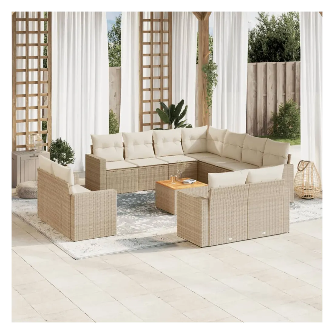 Cet ensemble de canapés de jardin est le complément parfait de votre arrière-cour, terrasse ou patio, offrant un espace confortable et accueillant pour discuter avec la famille et les amis ou simplement se détendre et profiter de l'extérieur. Matériau durable : la résine tressée, également connue sous le nom de poly rotin, est un matériau synthétique solide et nécessitant peu d'entretien qui ressemble au rotin naturel. Il est léger, facile à nettoyer et couramment utilisé pour les meubles d'extérieur en raison de sa durabilité et de ses propriétés de résistance aux intempéries.Fonction de rangement avec sac résistant à l'eau : chaque siège de jardin dispose d'un espace de rangement sous l'assise, complété par un sac résistant à l'eau pour ranger les coussins, les jouets et d'autres objets. Les sacs intérieurs sont dotés d'un couvercle et peuvent être solidement fixés aux sièges à l'aide de bandes auto-agrippantes pour plus de stabilité.Dessus stable et facile à nettoyer : cette table de jardin a un dessus en bois d'acacia robuste, durable et facile à nettoyer avec un chiffon humide.Housse amovible et lavable : ces coussins de siège sont dotés de housses amovibles pour un lavage et un entretien faciles.Conception modulaire : cet ensemble de meubles d'extérieur a une conception modulaire, ce qui le rend complètement flexible et facile à déplacer, afin que vous puissiez créer un agencement de meubles d'extérieur personnalisé. Bon à savoir :Pour que vos meubles d'extérieur restent beaux, nous vous recommandons de les protéger avec une housse imperméable.