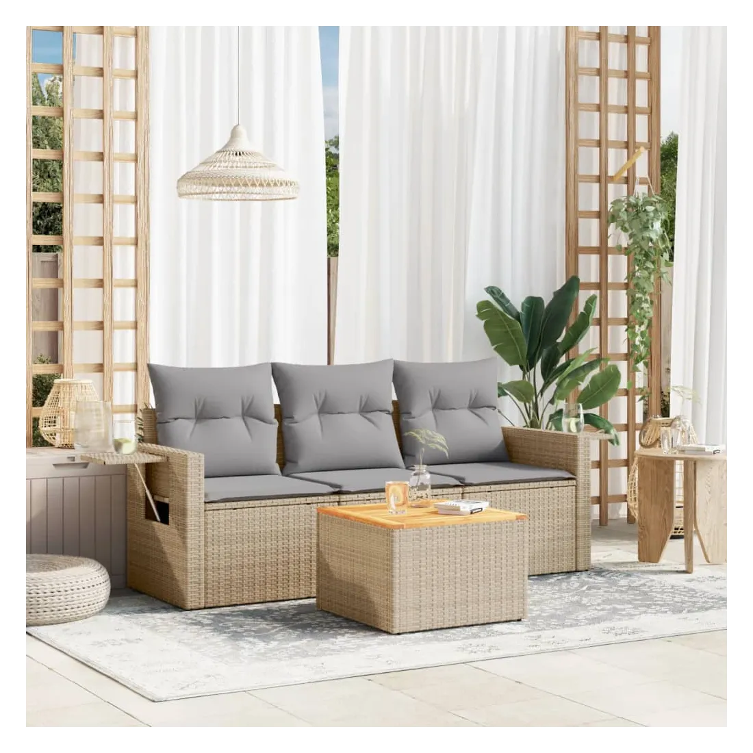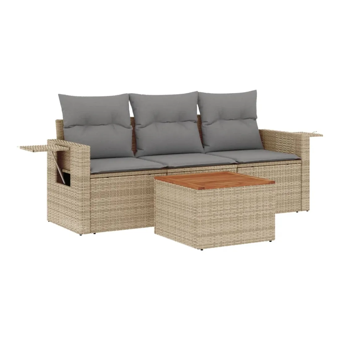 Cet ensemble de canapés de jardin est le complément parfait de votre arrière-cour, terrasse ou patio, offrant un espace confortable et accueillant pour discuter avec la famille et les amis ou simplement se détendre et profiter de l'extérieur. Matériau durable : la résine tressée, également connue sous le nom de poly rotin, est un matériau synthétique solide et nécessitant peu d'entretien qui ressemble au rotin naturel. Il est léger, facile à nettoyer et couramment utilisé pour les meubles d'extérieur en raison de sa durabilité et de ses propriétés de résistance aux intempéries.Fonction de rangement avec sac résistant à l'eau : chaque siège de jardin dispose d'un espace de rangement sous l'assise, complété par un sac résistant à l'eau pour ranger les coussins, les jouets et d'autres objets. Les sacs intérieurs sont dotés d'un couvercle et peuvent être solidement fixés aux sièges à l'aide de bandes auto-agrippantes pour plus de stabilité.Dessus stable et facile à nettoyer : cette table de jardin a un dessus en bois d'acacia robuste, durable et facile à nettoyer avec un chiffon humide.Table d'appoint pratique : ce mobilier d'extérieur comprend des tables d'appoint pliables avec un ressort à gaz sur les accoudoirs, offrant des endroits pratiques pour garder vos essentiels à portée de main.Conception modulaire : cet ensemble de meubles d'extérieur a une conception modulaire, ce qui le rend complètement flexible et facile à déplacer, afin que vous puissiez créer un agencement de meubles d'extérieur personnalisé. Bon à savoir :Pour que vos meubles d'extérieur restent beaux, nous vous recommandons de les protéger avec une housse imperméable.