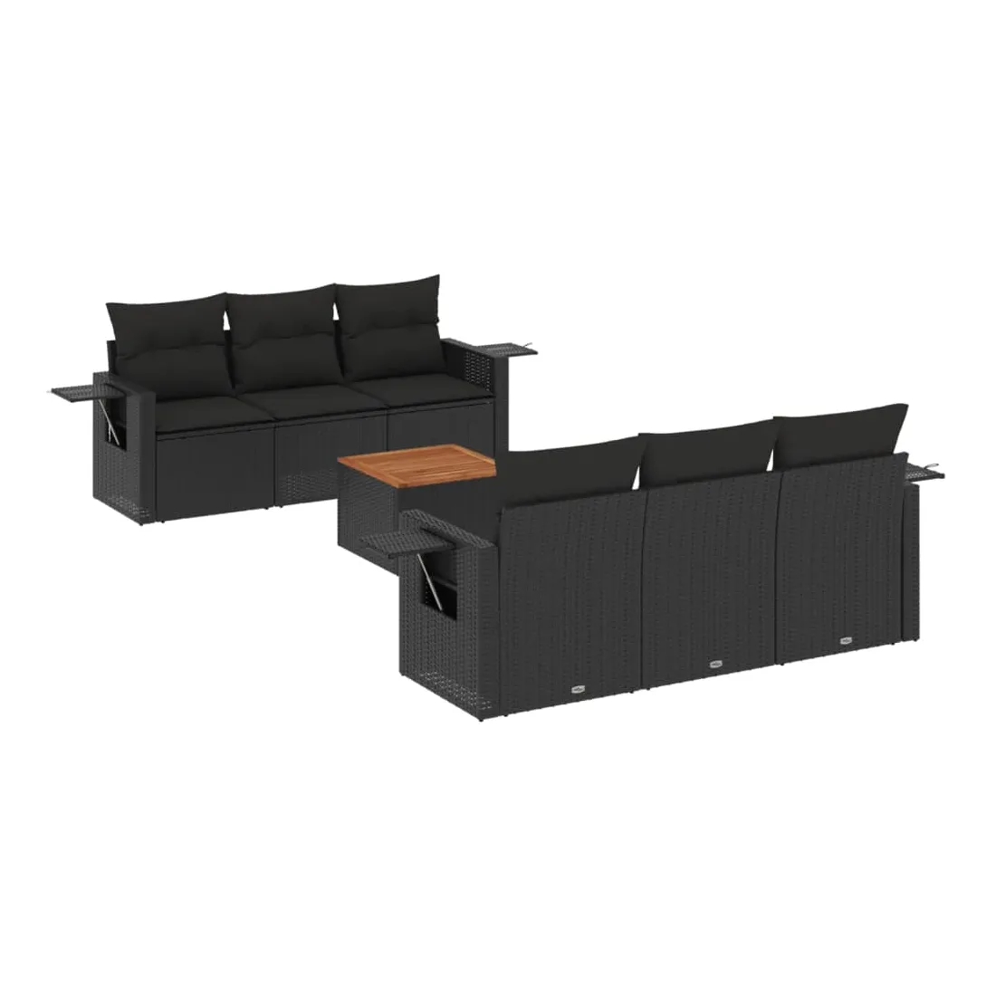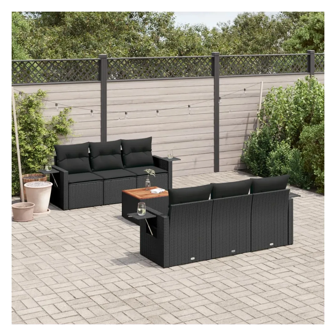 Cet ensemble de canapés de jardin est le complément parfait de votre arrière-cour, terrasse ou patio, offrant un espace confortable et accueillant pour discuter avec la famille et les amis ou simplement se détendre et profiter de l'extérieur. Matériau durable : la résine tressée, également connue sous le nom de poly rotin, est un matériau synthétique solide et nécessitant peu d'entretien qui ressemble au rotin naturel. Il est léger, facile à nettoyer et couramment utilisé pour les meubles d'extérieur en raison de sa durabilité et de ses propriétés de résistance aux intempéries.Fonction de rangement avec sac résistant à l'eau : chaque siège de jardin dispose d'un espace de rangement sous l'assise, complété par un sac résistant à l'eau pour ranger les coussins, les jouets et d'autres objets. Les sacs intérieurs sont dotés d'un couvercle et peuvent être solidement fixés aux sièges à l'aide de bandes auto-agrippantes pour plus de stabilité.Dessus stable et facile à nettoyer : cette table de jardin a un dessus en bois d'acacia robuste, durable et facile à nettoyer avec un chiffon humide.Table d'appoint pratique : ce mobilier d'extérieur comprend des tables d'appoint pliables avec un ressort à gaz sur les accoudoirs, offrant des endroits pratiques pour garder vos essentiels à portée de main.Conception modulaire : cet ensemble de meubles d'extérieur a une conception modulaire, ce qui le rend complètement flexible et facile à déplacer, afin que vous puissiez créer un agencement de meubles d'extérieur personnalisé. Bon à savoir :Pour que vos meubles d'extérieur restent beaux, nous vous recommandons de les protéger avec une housse imperméable.