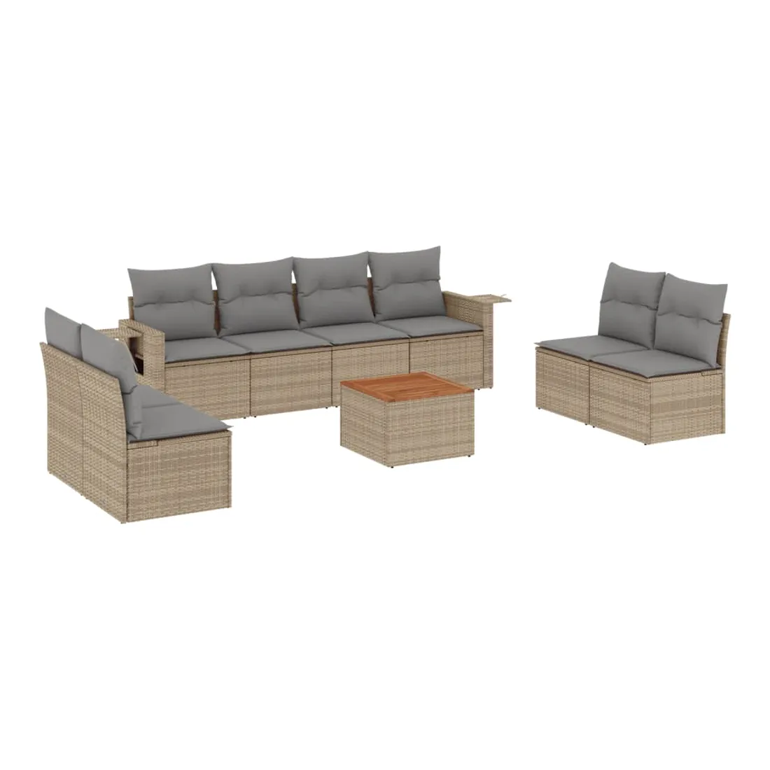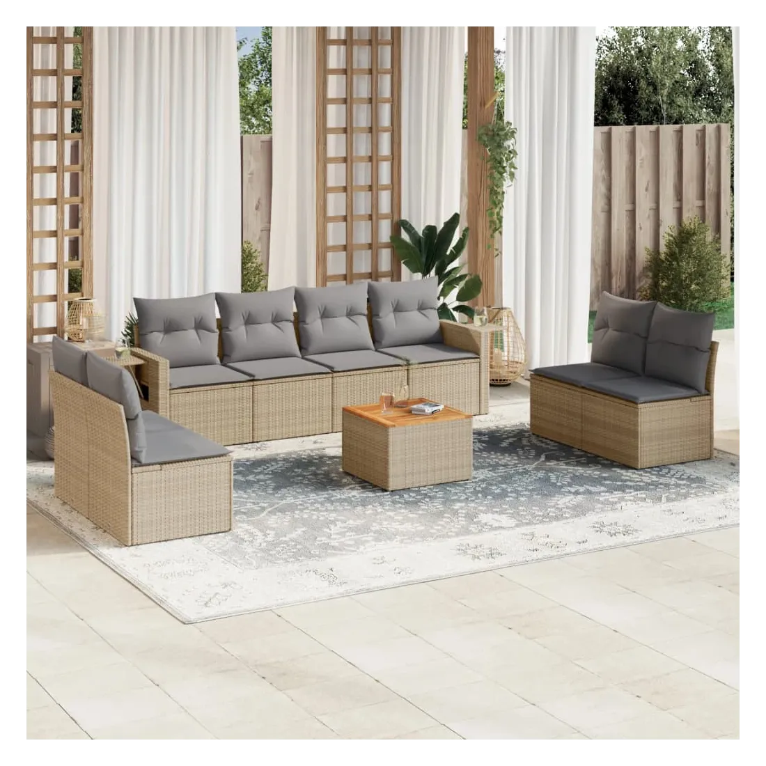 Cet ensemble de canapés de jardin est le complément parfait de votre arrière-cour, terrasse ou patio, offrant un espace confortable et accueillant pour discuter avec la famille et les amis ou simplement se détendre et profiter de l'extérieur. Matériau durable : la résine tressée, également connue sous le nom de poly rotin, est un matériau synthétique solide et nécessitant peu d'entretien qui ressemble au rotin naturel. Il est léger, facile à nettoyer et couramment utilisé pour les meubles d'extérieur en raison de sa durabilité et de ses propriétés de résistance aux intempéries.Fonction de rangement avec sac résistant à l'eau : chaque siège de jardin dispose d'un espace de rangement sous l'assise, complété par un sac résistant à l'eau pour ranger les coussins, les jouets et d'autres objets. Les sacs intérieurs sont dotés d'un couvercle et peuvent être solidement fixés aux sièges à l'aide de bandes auto-agrippantes pour plus de stabilité.Dessus stable et facile à nettoyer : cette table de jardin a un dessus en bois d'acacia robuste, durable et facile à nettoyer avec un chiffon humide.Table d'appoint pratique : ce mobilier d'extérieur comprend des tables d'appoint pliables avec un ressort à gaz sur les accoudoirs, offrant des endroits pratiques pour garder vos essentiels à portée de main.Conception modulaire : cet ensemble de meubles d'extérieur a une conception modulaire, ce qui le rend complètement flexible et facile à déplacer, afin que vous puissiez créer un agencement de meubles d'extérieur personnalisé. Bon à savoir :Pour que vos meubles d'extérieur restent beaux, nous vous recommandons de les protéger avec une housse imperméable.