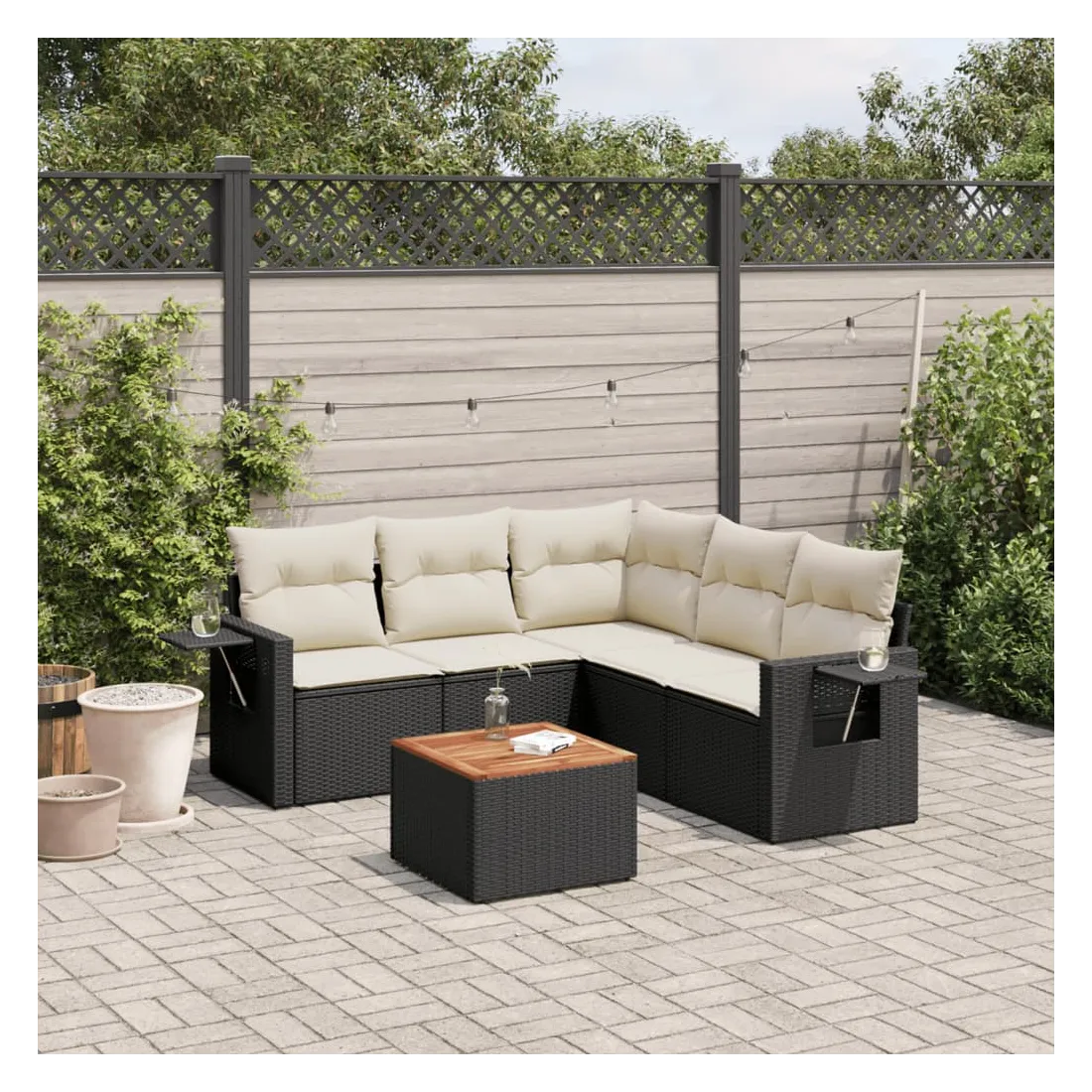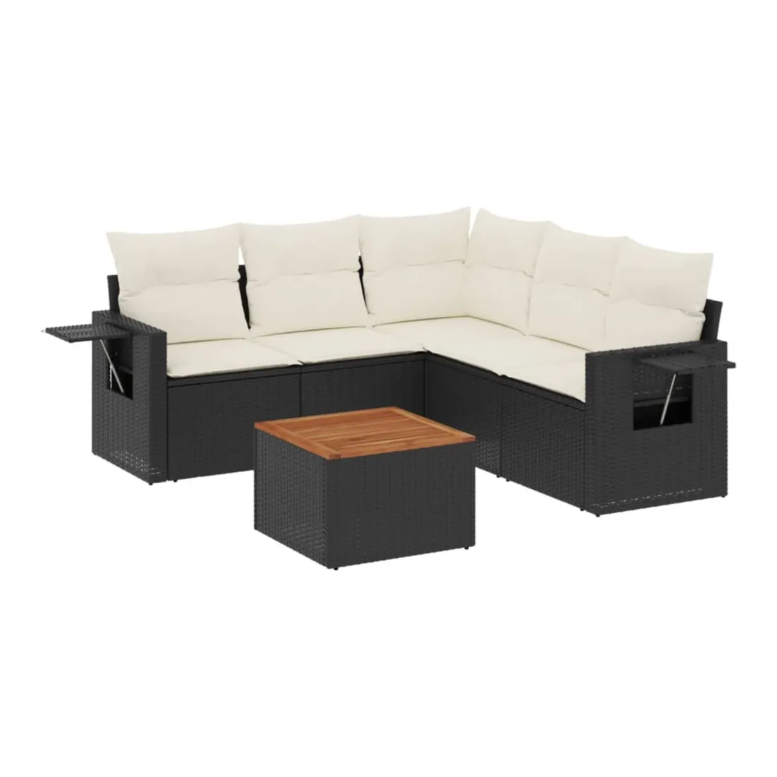 Cet ensemble de canapés de jardin est le complément parfait de votre arrière-cour, terrasse ou patio, offrant un espace confortable et accueillant pour discuter avec la famille et les amis ou simplement se détendre et profiter de l'extérieur. Matériau durable : la résine tressée, également connue sous le nom de poly rotin, est un matériau synthétique solide et nécessitant peu d'entretien qui ressemble au rotin naturel. Il est léger, facile à nettoyer et couramment utilisé pour les meubles d'extérieur en raison de sa durabilité et de ses propriétés de résistance aux intempéries.Fonction de rangement avec sac résistant à l'eau : chaque siège de jardin dispose d'un espace de rangement sous l'assise, complété par un sac résistant à l'eau pour ranger les coussins, les jouets et d'autres objets. Les sacs intérieurs sont dotés d'un couvercle et peuvent être solidement fixés aux sièges à l'aide de bandes auto-agrippantes pour plus de stabilité.Dessus stable et facile à nettoyer : cette table de jardin a un dessus en bois d'acacia robuste, durable et facile à nettoyer avec un chiffon humide.Table d'appoint pratique : ce mobilier d'extérieur comprend des tables d'appoint pliables avec un ressort à gaz sur les accoudoirs, offrant des endroits pratiques pour garder vos essentiels à portée de main.Conception modulaire : cet ensemble de meubles d'extérieur a une conception modulaire, ce qui le rend complètement flexible et facile à déplacer, afin que vous puissiez créer un agencement de meubles d'extérieur personnalisé. Bon à savoir :Pour que vos meubles d'extérieur restent beaux, nous vous recommandons de les protéger avec une housse imperméable.