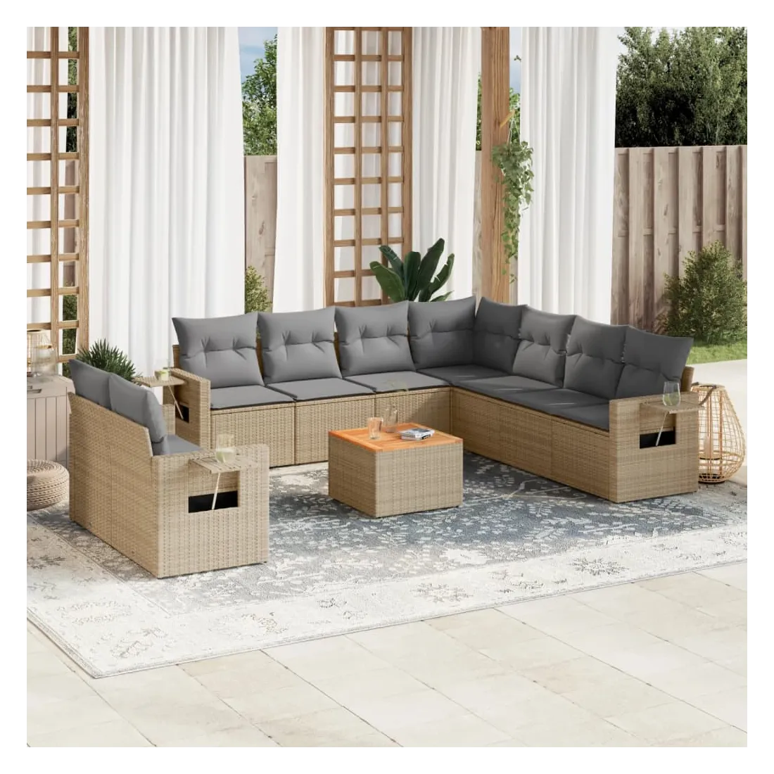 Cet ensemble de canapés de jardin est le complément parfait de votre arrière-cour, terrasse ou patio, offrant un espace confortable et accueillant pour discuter avec la famille et les amis ou simplement se détendre et profiter de l'extérieur. Matériau durable : la résine tressée, également connue sous le nom de poly rotin, est un matériau synthétique solide et nécessitant peu d'entretien qui ressemble au rotin naturel. Il est léger, facile à nettoyer et couramment utilisé pour les meubles d'extérieur en raison de sa durabilité et de ses propriétés de résistance aux intempéries.Fonction de rangement avec sac résistant à l'eau : chaque siège de jardin dispose d'un espace de rangement sous l'assise, complété par un sac résistant à l'eau pour ranger les coussins, les jouets et d'autres objets. Les sacs intérieurs sont dotés d'un couvercle et peuvent être solidement fixés aux sièges à l'aide de bandes auto-agrippantes pour plus de stabilité.Dessus stable et facile à nettoyer : cette table de jardin a un dessus en bois d'acacia robuste, durable et facile à nettoyer avec un chiffon humide.Table d'appoint pratique : ce mobilier d'extérieur comprend des tables d'appoint pliables avec un ressort à gaz sur les accoudoirs, offrant des endroits pratiques pour garder vos essentiels à portée de main.Conception modulaire : cet ensemble de meubles d'extérieur a une conception modulaire, ce qui le rend complètement flexible et facile à déplacer, afin que vous puissiez créer un agencement de meubles d'extérieur personnalisé. Bon à savoir :Pour que vos meubles d'extérieur restent beaux, nous vous recommandons de les protéger avec une housse imperméable.