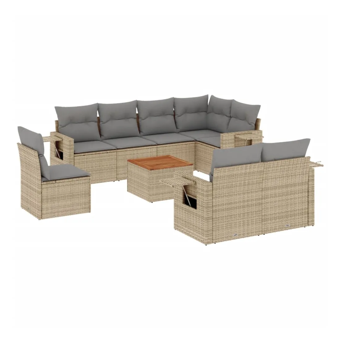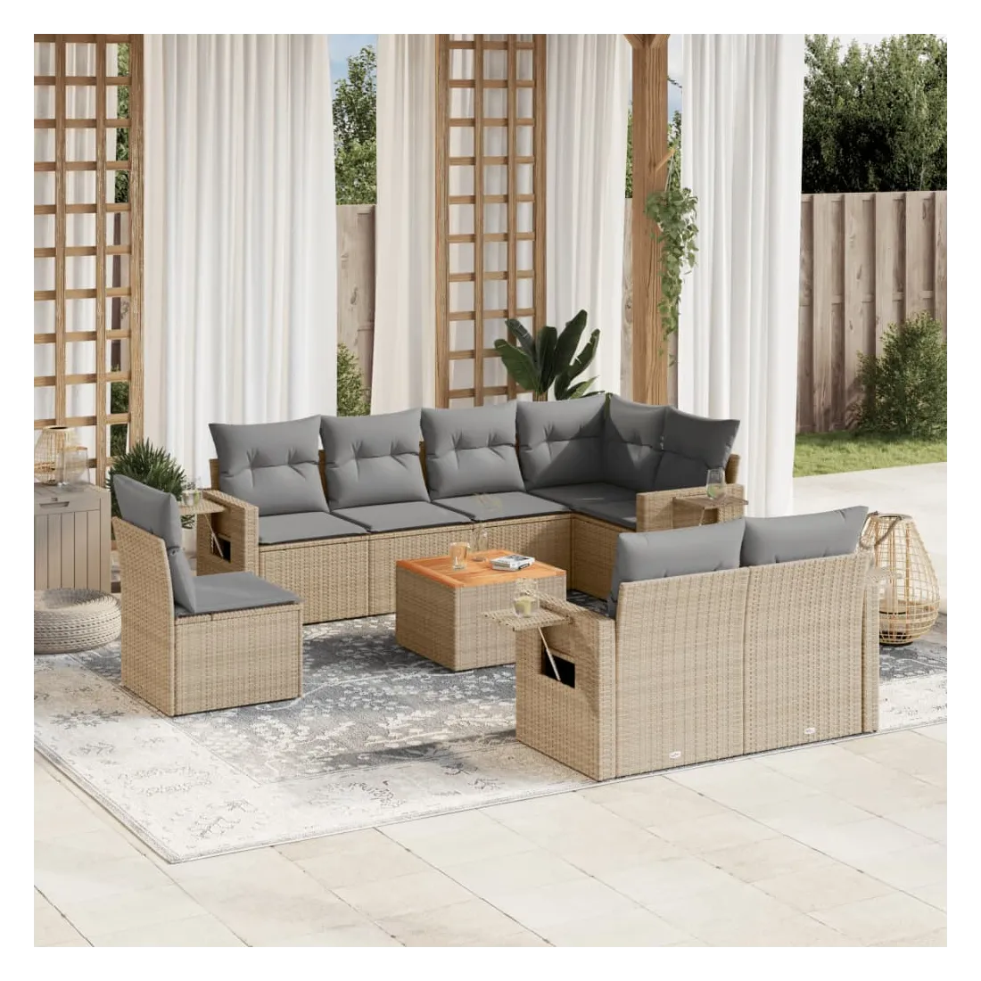 Cet ensemble de canapés de jardin est le complément parfait de votre arrière-cour, terrasse ou patio, offrant un espace confortable et accueillant pour discuter avec la famille et les amis ou simplement se détendre et profiter de l'extérieur. Matériau durable : la résine tressée, également connue sous le nom de poly rotin, est un matériau synthétique solide et nécessitant peu d'entretien qui ressemble au rotin naturel. Il est léger, facile à nettoyer et couramment utilisé pour les meubles d'extérieur en raison de sa durabilité et de ses propriétés de résistance aux intempéries.Fonction de rangement avec sac résistant à l'eau : chaque siège de jardin dispose d'un espace de rangement sous l'assise, complété par un sac résistant à l'eau pour ranger les coussins, les jouets et d'autres objets. Les sacs intérieurs sont dotés d'un couvercle et peuvent être solidement fixés aux sièges à l'aide de bandes auto-agrippantes pour plus de stabilité.Dessus stable et facile à nettoyer : cette table de jardin a un dessus en bois d'acacia robuste, durable et facile à nettoyer avec un chiffon humide.Table d'appoint pratique : ce mobilier d'extérieur comprend des tables d'appoint pliables avec un ressort à gaz sur les accoudoirs, offrant des endroits pratiques pour garder vos essentiels à portée de main.Conception modulaire : cet ensemble de meubles d'extérieur a une conception modulaire, ce qui le rend complètement flexible et facile à déplacer, afin que vous puissiez créer un agencement de meubles d'extérieur personnalisé. Bon à savoir :Pour que vos meubles d'extérieur restent beaux, nous vous recommandons de les protéger avec une housse imperméable.