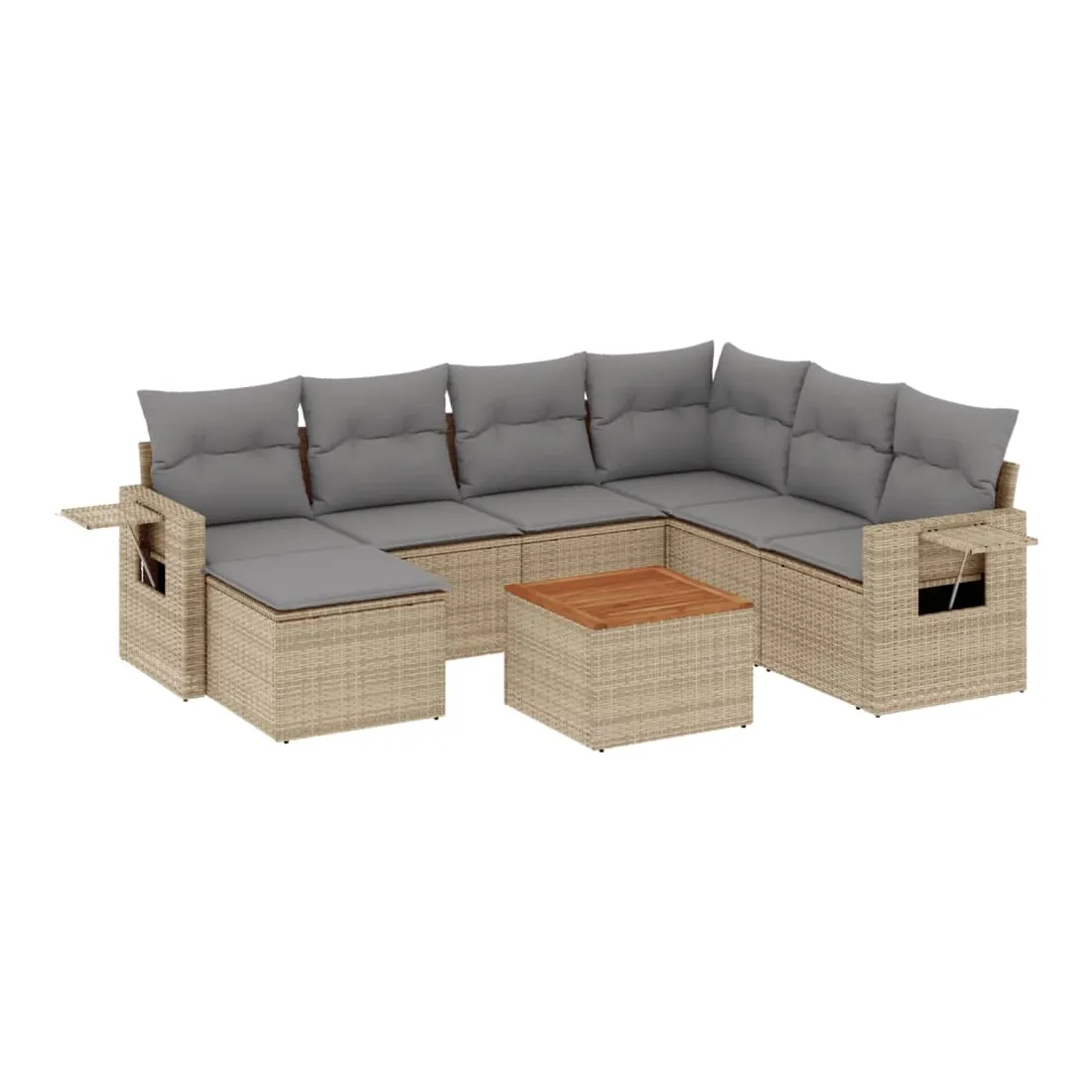 Cet ensemble de canapés de jardin est le complément parfait de votre arrière-cour, terrasse ou patio, offrant un espace confortable et accueillant pour discuter avec la famille et les amis ou simplement se détendre et profiter de l'extérieur. Matériau durable : la résine tressée, également connue sous le nom de poly rotin, est un matériau synthétique solide et nécessitant peu d'entretien qui ressemble au rotin naturel. Il est léger, facile à nettoyer et couramment utilisé pour les meubles d'extérieur en raison de sa durabilité et de ses propriétés de résistance aux intempéries.Fonction de rangement avec sac résistant à l'eau : chaque siège de jardin dispose d'un espace de rangement sous l'assise, complété par un sac résistant à l'eau pour ranger les coussins, les jouets et d'autres objets. Les sacs intérieurs sont dotés d'un couvercle et peuvent être solidement fixés aux sièges à l'aide de bandes auto-agrippantes pour plus de stabilité.Dessus stable et facile à nettoyer : cette table de jardin a un dessus en bois d'acacia robuste, durable et facile à nettoyer avec un chiffon humide.Table d'appoint pratique : ce mobilier d'extérieur comprend des tables d'appoint pliables avec un ressort à gaz sur les accoudoirs, offrant des endroits pratiques pour garder vos essentiels à portée de main.Conception modulaire : cet ensemble de meubles d'extérieur a une conception modulaire, ce qui le rend complètement flexible et facile à déplacer, afin que vous puissiez créer un agencement de meubles d'extérieur personnalisé. Bon à savoir :Pour que vos meubles d'extérieur restent beaux, nous vous recommandons de les protéger avec une housse imperméable.