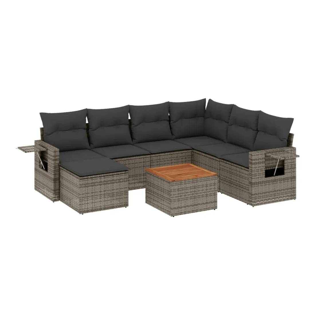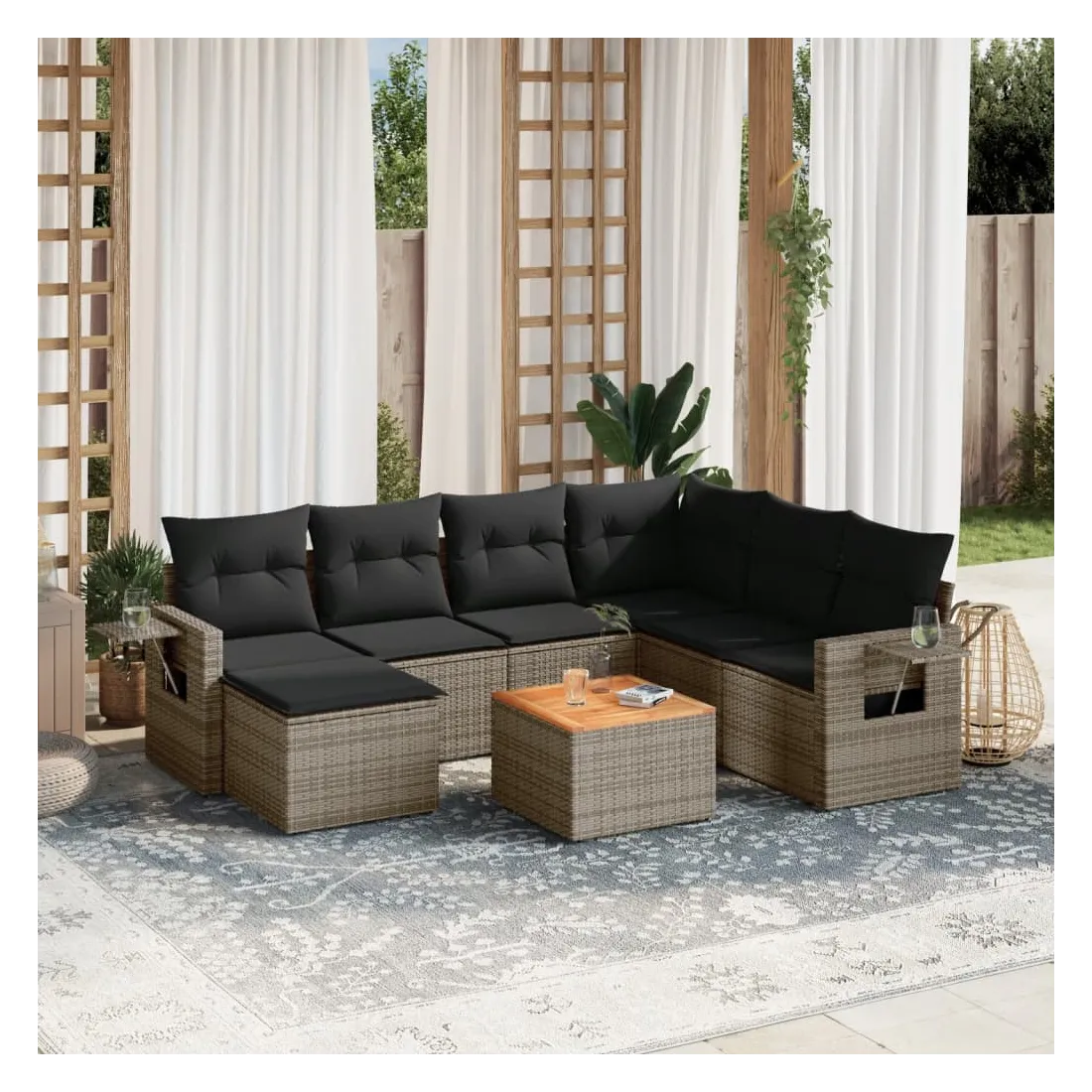 Cet ensemble de canapés de jardin est le complément parfait de votre arrière-cour, terrasse ou patio, offrant un espace confortable et accueillant pour discuter avec la famille et les amis ou simplement se détendre et profiter de l'extérieur. Matériau durable : la résine tressée, également connue sous le nom de poly rotin, est un matériau synthétique solide et nécessitant peu d'entretien qui ressemble au rotin naturel. Il est léger, facile à nettoyer et couramment utilisé pour les meubles d'extérieur en raison de sa durabilité et de ses propriétés de résistance aux intempéries.Fonction de rangement avec sac résistant à l'eau : chaque siège de jardin dispose d'un espace de rangement sous l'assise, complété par un sac résistant à l'eau pour ranger les coussins, les jouets et d'autres objets. Les sacs intérieurs sont dotés d'un couvercle et peuvent être solidement fixés aux sièges à l'aide de bandes auto-agrippantes pour plus de stabilité.Dessus stable et facile à nettoyer : cette table de jardin a un dessus en bois d'acacia robuste, durable et facile à nettoyer avec un chiffon humide.Table d'appoint pratique : ce mobilier d'extérieur comprend des tables d'appoint pliables avec un ressort à gaz sur les accoudoirs, offrant des endroits pratiques pour garder vos essentiels à portée de main.Conception modulaire : cet ensemble de meubles d'extérieur a une conception modulaire, ce qui le rend complètement flexible et facile à déplacer, afin que vous puissiez créer un agencement de meubles d'extérieur personnalisé. Bon à savoir :Pour que vos meubles d'extérieur restent beaux, nous vous recommandons de les protéger avec une housse imperméable.