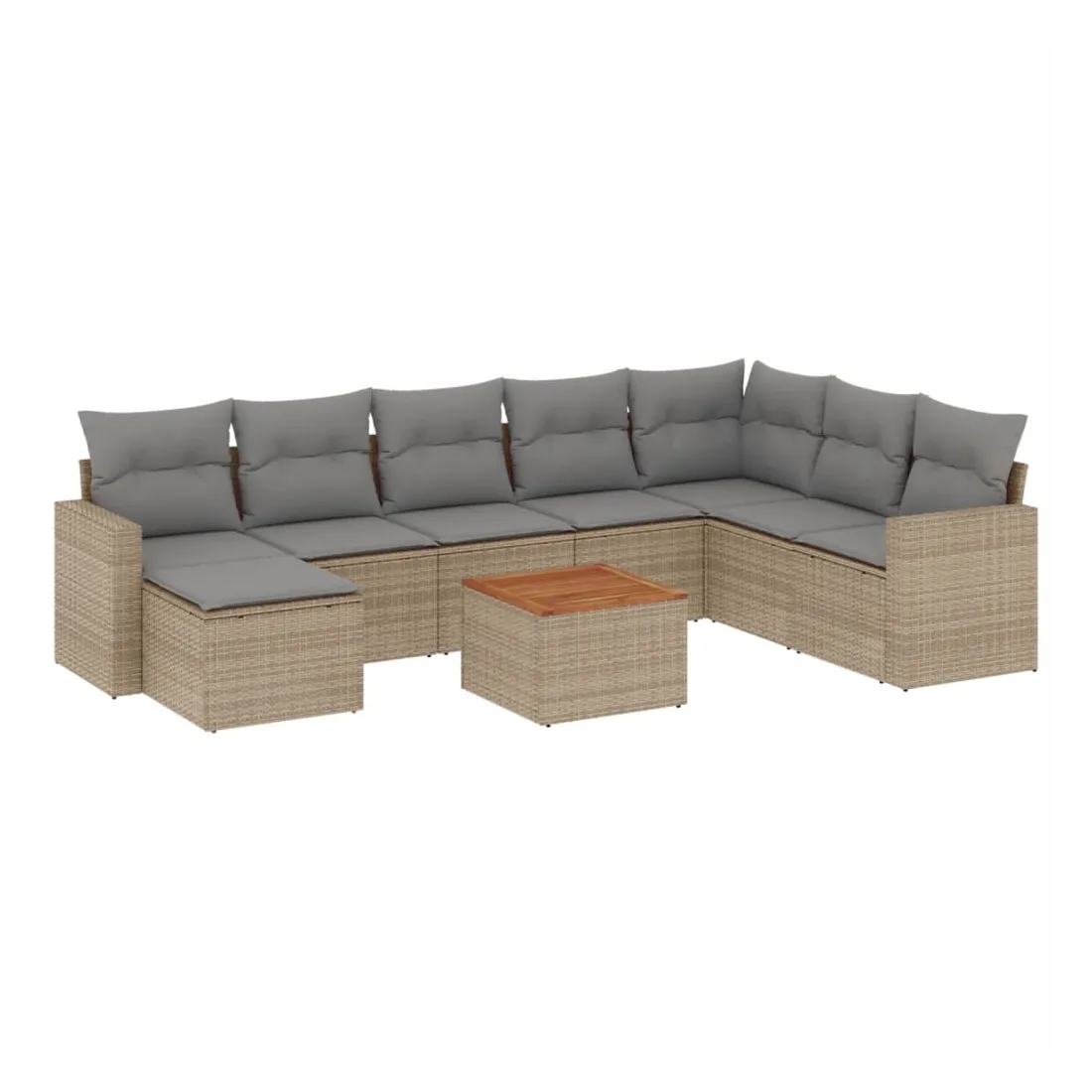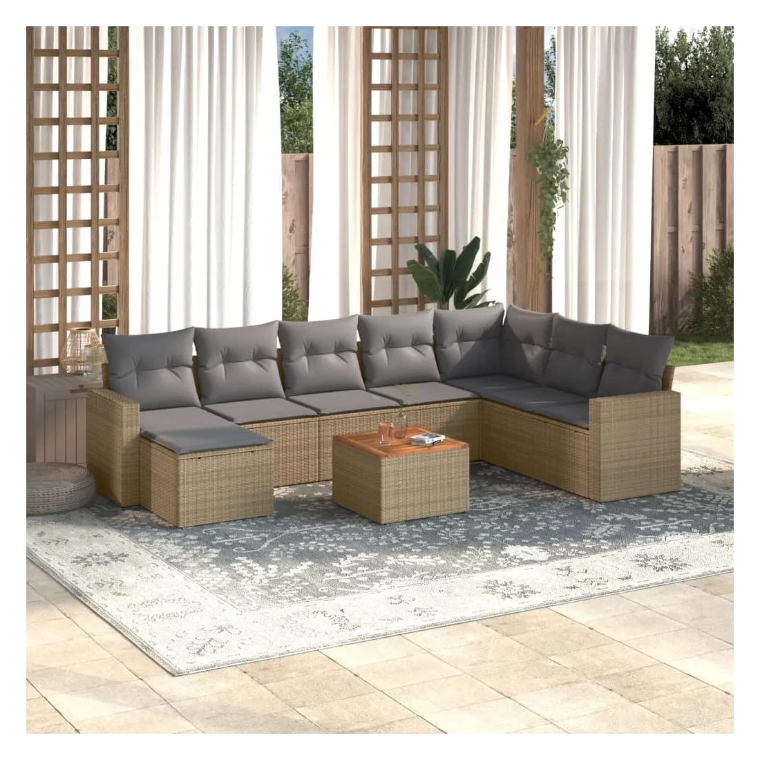 Cet ensemble de canapés de jardin est le complément parfait de votre arrière-cour, terrasse ou patio, offrant un espace confortable et accueillant pour discuter avec la famille et les amis ou simplement se détendre et profiter de l'extérieur. Matériau durable : la résine tressée, également connue sous le nom de poly rotin, est un matériau synthétique solide et nécessitant peu d'entretien qui ressemble au rotin naturel. Il est léger, facile à nettoyer et couramment utilisé pour les meubles d'extérieur en raison de sa durabilité et de ses propriétés de résistance aux intempéries.Fonction de rangement avec sac résistant à l'eau : chaque siège de jardin dispose d'un espace de rangement sous l'assise, complété par un sac résistant à l'eau pour ranger les coussins, les jouets et d'autres objets. Les sacs intérieurs sont dotés d'un couvercle et peuvent être solidement fixés aux sièges à l'aide de bandes auto-agrippantes pour plus de stabilité.Dessus stable et facile à nettoyer : cette table de jardin a un dessus en bois d'acacia robuste, durable et facile à nettoyer avec un chiffon humide.Table d'appoint pratique : ce mobilier d'extérieur comprend des tables d'appoint pliables avec un ressort à gaz sur les accoudoirs, offrant des endroits pratiques pour garder vos essentiels à portée de main.Conception modulaire : cet ensemble de meubles d'extérieur a une conception modulaire, ce qui le rend complètement flexible et facile à déplacer, afin que vous puissiez créer un agencement de meubles d'extérieur personnalisé. Bon à savoir :Pour que vos meubles d'extérieur restent beaux, nous vous recommandons de les protéger avec une housse imperméable.