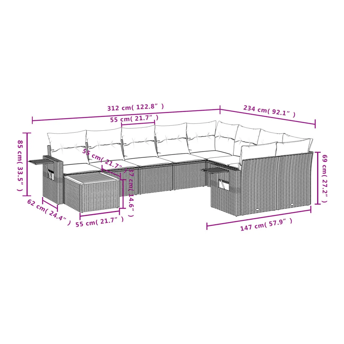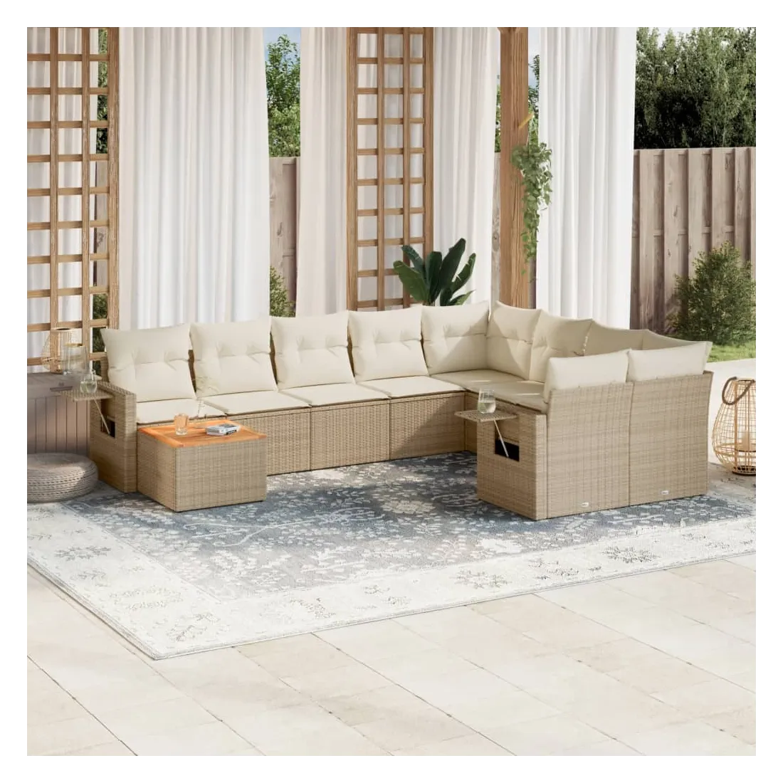 Cet ensemble de canapés de jardin est le complément parfait de votre arrière-cour, terrasse ou patio, offrant un espace confortable et accueillant pour discuter avec la famille et les amis ou simplement se détendre et profiter de l'extérieur. Matériau durable : la résine tressée, également connue sous le nom de poly rotin, est un matériau synthétique solide et nécessitant peu d'entretien qui ressemble au rotin naturel. Il est léger, facile à nettoyer et couramment utilisé pour les meubles d'extérieur en raison de sa durabilité et de ses propriétés de résistance aux intempéries.Fonction de rangement avec sac résistant à l'eau : chaque siège de jardin dispose d'un espace de rangement sous l'assise, complété par un sac résistant à l'eau pour ranger les coussins, les jouets et d'autres objets. Les sacs intérieurs sont dotés d'un couvercle et peuvent être solidement fixés aux sièges à l'aide de bandes auto-agrippantes pour plus de stabilité.Dessus stable et facile à nettoyer : cette table de jardin a un dessus en bois d'acacia robuste, durable et facile à nettoyer avec un chiffon humide.Table d'appoint pratique : ce mobilier d'extérieur comprend des tables d'appoint pliables avec un ressort à gaz sur les accoudoirs, offrant des endroits pratiques pour garder vos essentiels à portée de main.Conception modulaire : cet ensemble de meubles d'extérieur a une conception modulaire, ce qui le rend complètement flexible et facile à déplacer, afin que vous puissiez créer un agencement de meubles d'extérieur personnalisé. Bon à savoir :Pour que vos meubles d'extérieur restent beaux, nous vous recommandons de les protéger avec une housse imperméable.