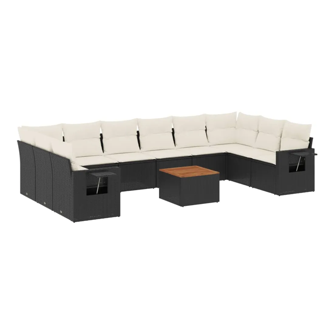 Cet ensemble de canapés de jardin est le complément parfait de votre arrière-cour, terrasse ou patio, offrant un espace confortable et accueillant pour discuter avec la famille et les amis ou simplement se détendre et profiter de l'extérieur. Matériau durable : la résine tressée, également connue sous le nom de poly rotin, est un matériau synthétique solide et nécessitant peu d'entretien qui ressemble au rotin naturel. Il est léger, facile à nettoyer et couramment utilisé pour les meubles d'extérieur en raison de sa durabilité et de ses propriétés de résistance aux intempéries.Fonction de rangement avec sac résistant à l'eau : chaque siège de jardin dispose d'un espace de rangement sous l'assise, complété par un sac résistant à l'eau pour ranger les coussins, les jouets et d'autres objets. Les sacs intérieurs sont dotés d'un couvercle et peuvent être solidement fixés aux sièges à l'aide de bandes auto-agrippantes pour plus de stabilité.Dessus stable et facile à nettoyer : cette table de jardin a un dessus en bois d'acacia robuste, durable et facile à nettoyer avec un chiffon humide.Table d'appoint pratique : ce mobilier d'extérieur comprend des tables d'appoint pliables avec un ressort à gaz sur les accoudoirs, offrant des endroits pratiques pour garder vos essentiels à portée de main.Conception modulaire : cet ensemble de meubles d'extérieur a une conception modulaire, ce qui le rend complètement flexible et facile à déplacer, afin que vous puissiez créer un agencement de meubles d'extérieur personnalisé. Bon à savoir :Pour que vos meubles d'extérieur restent beaux, nous vous recommandons de les protéger avec une housse imperméable.