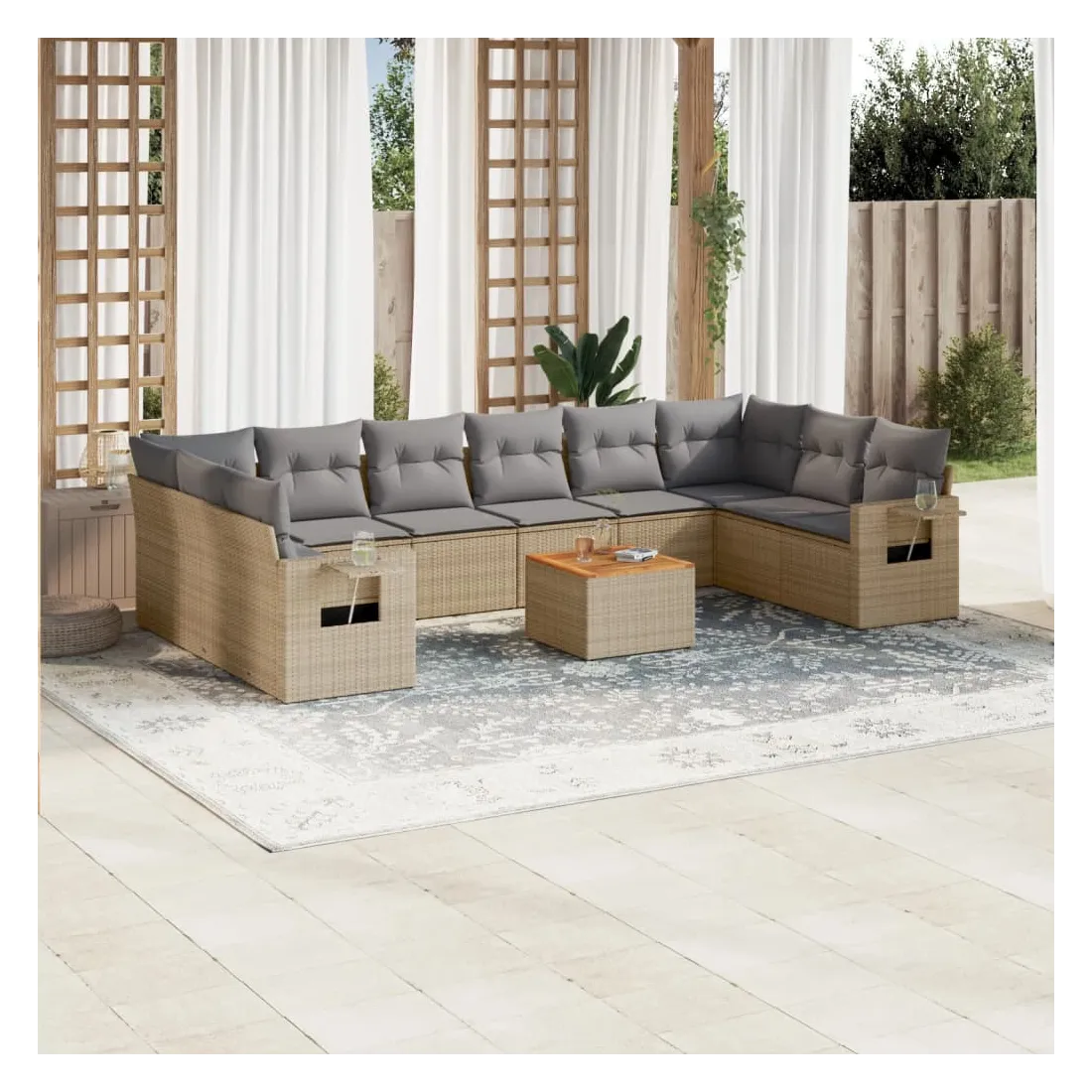 Cet ensemble de canapés de jardin est le complément parfait de votre arrière-cour, terrasse ou patio, offrant un espace confortable et accueillant pour discuter avec la famille et les amis ou simplement se détendre et profiter de l'extérieur. Matériau durable : la résine tressée, également connue sous le nom de poly rotin, est un matériau synthétique solide et nécessitant peu d'entretien qui ressemble au rotin naturel. Il est léger, facile à nettoyer et couramment utilisé pour les meubles d'extérieur en raison de sa durabilité et de ses propriétés de résistance aux intempéries.Fonction de rangement avec sac résistant à l'eau : chaque siège de jardin dispose d'un espace de rangement sous l'assise, complété par un sac résistant à l'eau pour ranger les coussins, les jouets et d'autres objets. Les sacs intérieurs sont dotés d'un couvercle et peuvent être solidement fixés aux sièges à l'aide de bandes auto-agrippantes pour plus de stabilité.Dessus stable et facile à nettoyer : cette table de jardin a un dessus en bois d'acacia robuste, durable et facile à nettoyer avec un chiffon humide.Table d'appoint pratique : ce mobilier d'extérieur comprend des tables d'appoint pliables avec un ressort à gaz sur les accoudoirs, offrant des endroits pratiques pour garder vos essentiels à portée de main.Conception modulaire : cet ensemble de meubles d'extérieur a une conception modulaire, ce qui le rend complètement flexible et facile à déplacer, afin que vous puissiez créer un agencement de meubles d'extérieur personnalisé. Bon à savoir :Pour que vos meubles d'extérieur restent beaux, nous vous recommandons de les protéger avec une housse imperméable.