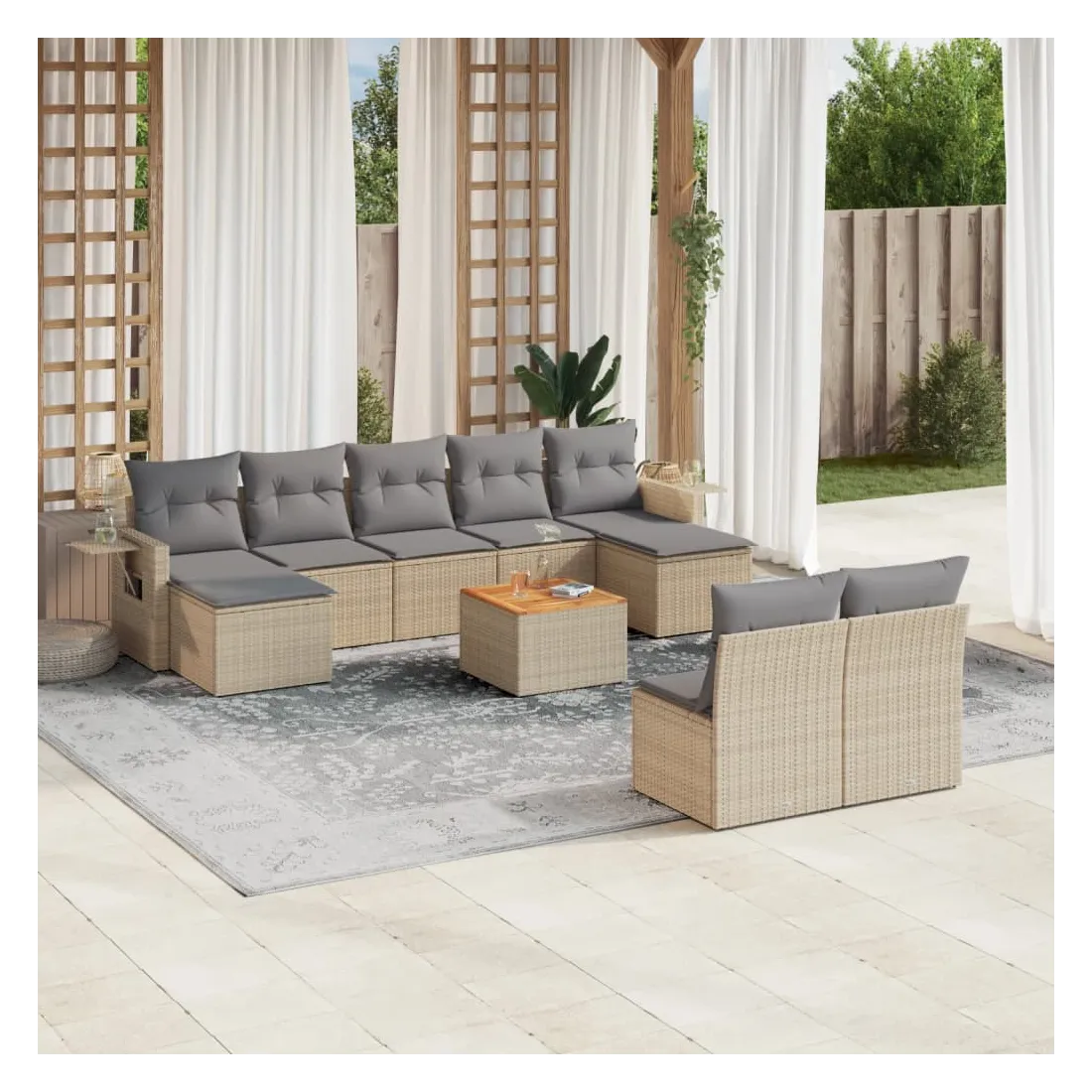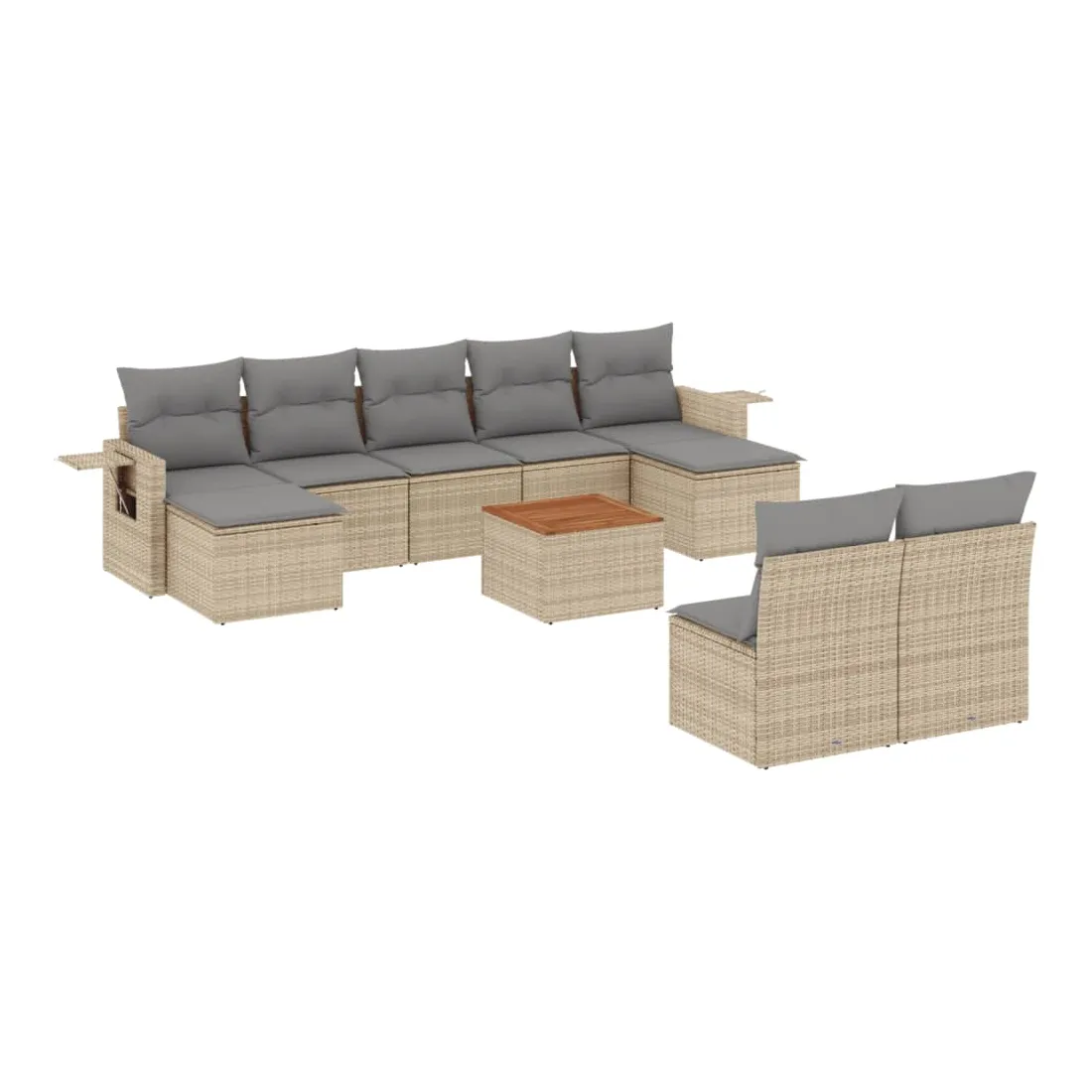 Cet ensemble de canapés de jardin est le complément parfait de votre arrière-cour, terrasse ou patio, offrant un espace confortable et accueillant pour discuter avec la famille et les amis ou simplement se détendre et profiter de l'extérieur. Matériau durable : la résine tressée, également connue sous le nom de poly rotin, est un matériau synthétique solide et nécessitant peu d'entretien qui ressemble au rotin naturel. Il est léger, facile à nettoyer et couramment utilisé pour les meubles d'extérieur en raison de sa durabilité et de ses propriétés de résistance aux intempéries.Fonction de rangement avec sac résistant à l'eau : chaque siège de jardin dispose d'un espace de rangement sous l'assise, complété par un sac résistant à l'eau pour ranger les coussins, les jouets et d'autres objets. Les sacs intérieurs sont dotés d'un couvercle et peuvent être solidement fixés aux sièges à l'aide de bandes auto-agrippantes pour plus de stabilité.Dessus stable et facile à nettoyer : cette table de jardin a un dessus en bois d'acacia robuste, durable et facile à nettoyer avec un chiffon humide.Table d'appoint pratique : ce mobilier d'extérieur comprend des tables d'appoint pliables avec un ressort à gaz sur les accoudoirs, offrant des endroits pratiques pour garder vos essentiels à portée de main.Conception modulaire : cet ensemble de meubles d'extérieur a une conception modulaire, ce qui le rend complètement flexible et facile à déplacer, afin que vous puissiez créer un agencement de meubles d'extérieur personnalisé. Bon à savoir :Pour que vos meubles d'extérieur restent beaux, nous vous recommandons de les protéger avec une housse imperméable.