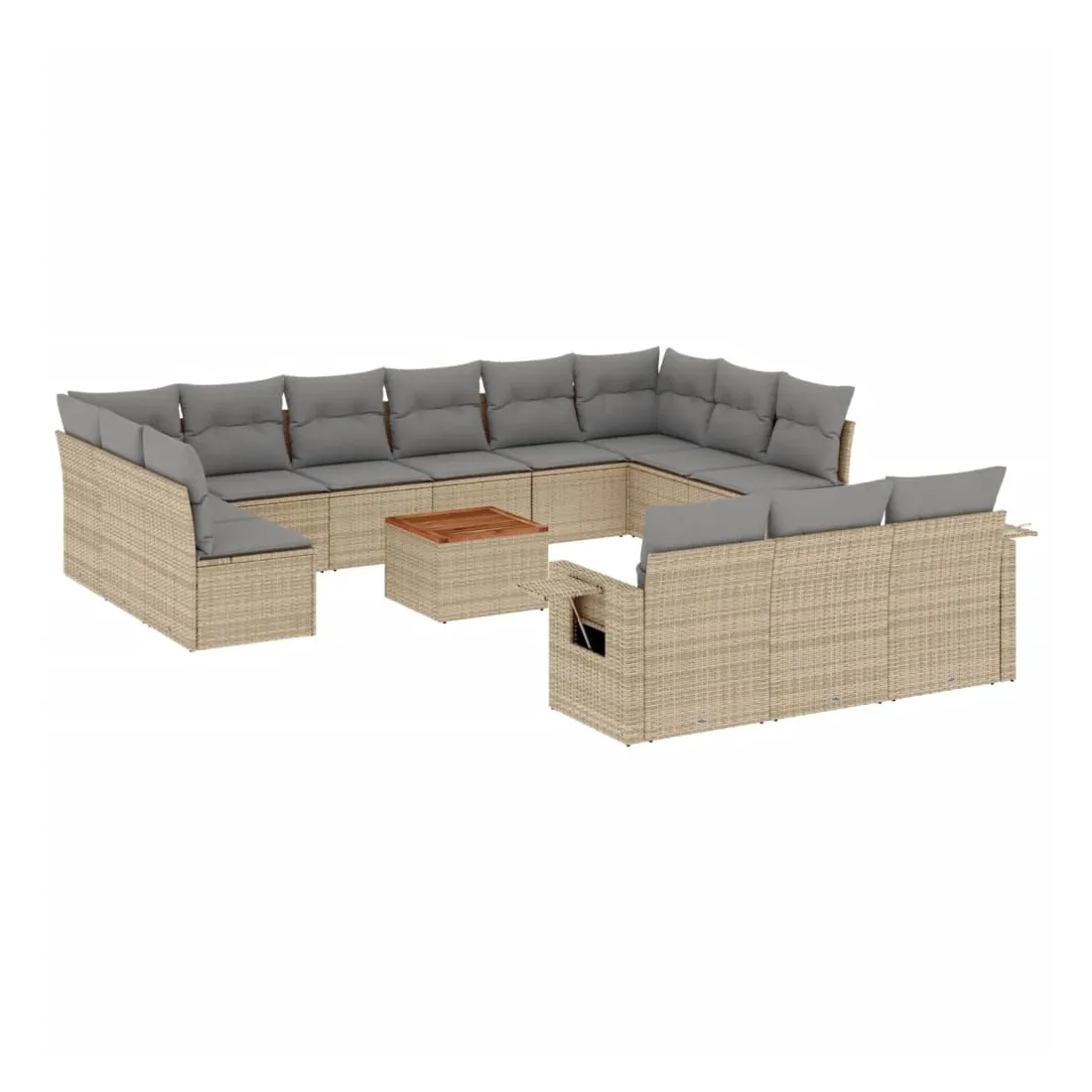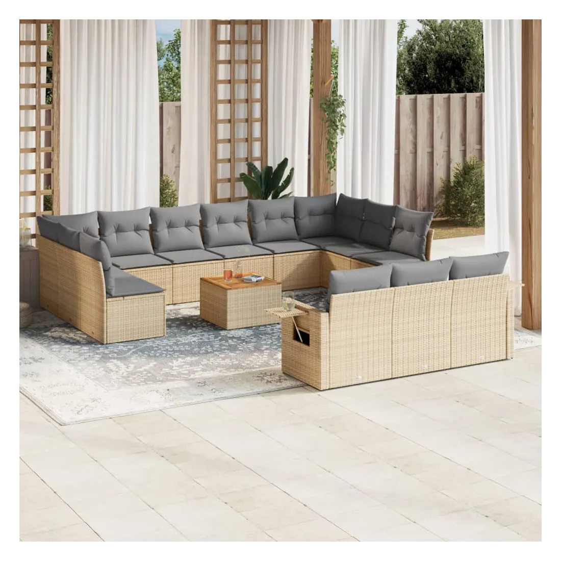Cet ensemble de canapés de jardin est le complément parfait de votre arrière-cour, terrasse ou patio, offrant un espace confortable et accueillant pour discuter avec la famille et les amis ou simplement se détendre et profiter de l'extérieur. Matériau durable : la résine tressée, également connue sous le nom de poly rotin, est un matériau synthétique solide et nécessitant peu d'entretien qui ressemble au rotin naturel. Il est léger, facile à nettoyer et couramment utilisé pour les meubles d'extérieur en raison de sa durabilité et de ses propriétés de résistance aux intempéries.Fonction de rangement avec sac résistant à l'eau : chaque siège de jardin dispose d'un espace de rangement sous l'assise, complété par un sac résistant à l'eau pour ranger les coussins, les jouets et d'autres objets. Les sacs intérieurs sont dotés d'un couvercle et peuvent être solidement fixés aux sièges à l'aide de bandes auto-agrippantes pour plus de stabilité.Dessus stable et facile à nettoyer : cette table de jardin a un dessus en bois d'acacia robuste, durable et facile à nettoyer avec un chiffon humide.Table d'appoint pratique : ce mobilier d'extérieur comprend des tables d'appoint pliables avec un ressort à gaz sur les accoudoirs, offrant des endroits pratiques pour garder vos essentiels à portée de main.Conception modulaire : cet ensemble de meubles d'extérieur a une conception modulaire, ce qui le rend complètement flexible et facile à déplacer, afin que vous puissiez créer un agencement de meubles d'extérieur personnalisé. Bon à savoir :Pour que vos meubles d'extérieur restent beaux, nous vous recommandons de les protéger avec une housse imperméable.