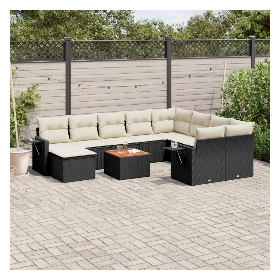 Cet ensemble de canapés de jardin est le complément parfait de votre arrière-cour, terrasse ou patio, offrant un espace confortable et accueillant pour discuter avec la famille et les amis ou simplement se détendre et profiter de l'extérieur. Matériau durable : la résine tressée, également connue sous le nom de poly rotin, est un matériau synthétique solide et nécessitant peu d'entretien qui ressemble au rotin naturel. Il est léger, facile à nettoyer et couramment utilisé pour les meubles d'extérieur en raison de sa durabilité et de ses propriétés de résistance aux intempéries.Fonction de rangement avec sac résistant à l'eau : chaque siège de jardin dispose d'un espace de rangement sous l'assise, complété par un sac résistant à l'eau pour ranger les coussins, les jouets et d'autres objets. Les sacs intérieurs sont dotés d'un couvercle et peuvent être solidement fixés aux sièges à l'aide de bandes auto-agrippantes pour plus de stabilité.Dessus stable et facile à nettoyer : cette table de jardin a un dessus en bois d'acacia robuste, durable et facile à nettoyer avec un chiffon humide.Table d'appoint pratique : ce mobilier d'extérieur comprend des tables d'appoint pliables avec un ressort à gaz sur les accoudoirs, offrant des endroits pratiques pour garder vos essentiels à portée de main.Conception modulaire : cet ensemble de meubles d'extérieur a une conception modulaire, ce qui le rend complètement flexible et facile à déplacer, afin que vous puissiez créer un agencement de meubles d'extérieur personnalisé. Bon à savoir :Pour que vos meubles d'extérieur restent beaux, nous vous recommandons de les protéger avec une housse imperméable.