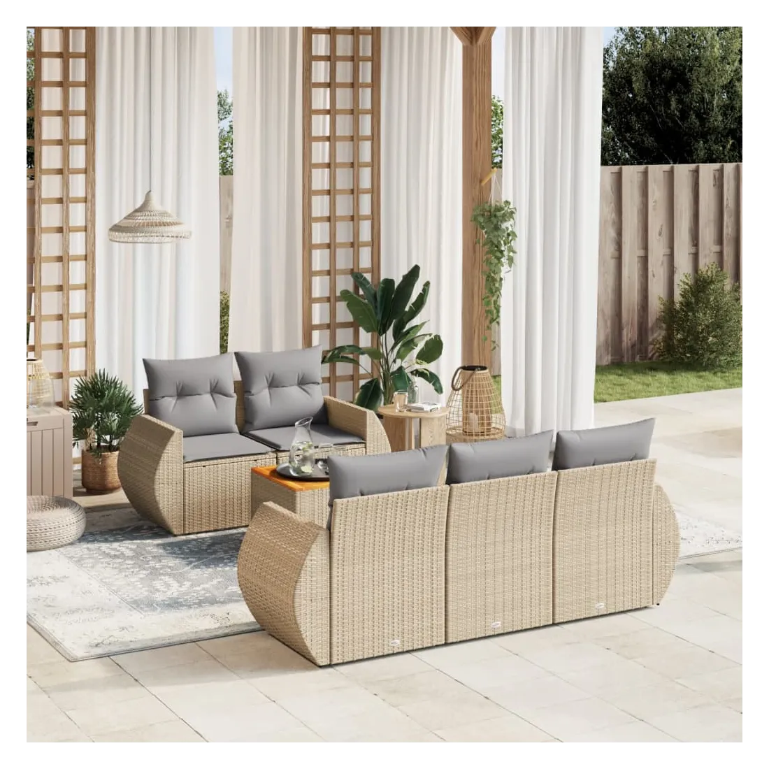 Cet ensemble de canapés de jardin est le complément parfait de votre arrière-cour, terrasse ou patio, offrant un espace confortable et accueillant pour discuter avec la famille et les amis ou simplement se détendre et profiter de l'extérieur. Matériau durable : la résine tressée, également connue sous le nom de poly rotin, est un matériau synthétique solide et nécessitant peu d'entretien qui ressemble au rotin naturel. Il est léger, facile à nettoyer et couramment utilisé pour les meubles d'extérieur en raison de sa durabilité et de ses propriétés de résistance aux intempéries.Dessus stable et facile à nettoyer : cette table de jardin a un dessus en bois d'acacia robuste, durable et facile à nettoyer avec un chiffon humide. Fonction de rangement avec sac résistant à l'eau : chaque siège de jardin dispose d'un espace de rangement sous l'assise, complété par un sac résistant à l'eau pour ranger les coussins, les jouets et d'autres objets. Les sacs intérieurs sont dotés d'un couvercle et peuvent être solidement fixés aux sièges à l'aide de bandes auto-agrippantes pour plus de stabilité.Expérience d'assise confortable : ce mobilier d'extérieur, doté de coussins épais, offre une expérience d'assise confortable.Conception modulaire : cet ensemble de meubles d'extérieur a une conception modulaire, ce qui le rend complètement flexible et facile à déplacer, afin que vous puissiez créer un agencement de meubles d'extérieur personnalisé. Bon à savoir :Pour que vos meubles d'extérieur restent beaux, nous vous recommandons de les protéger avec une housse imperméable.