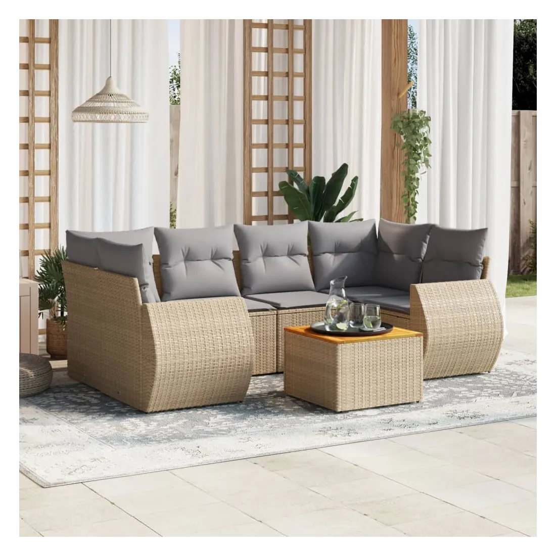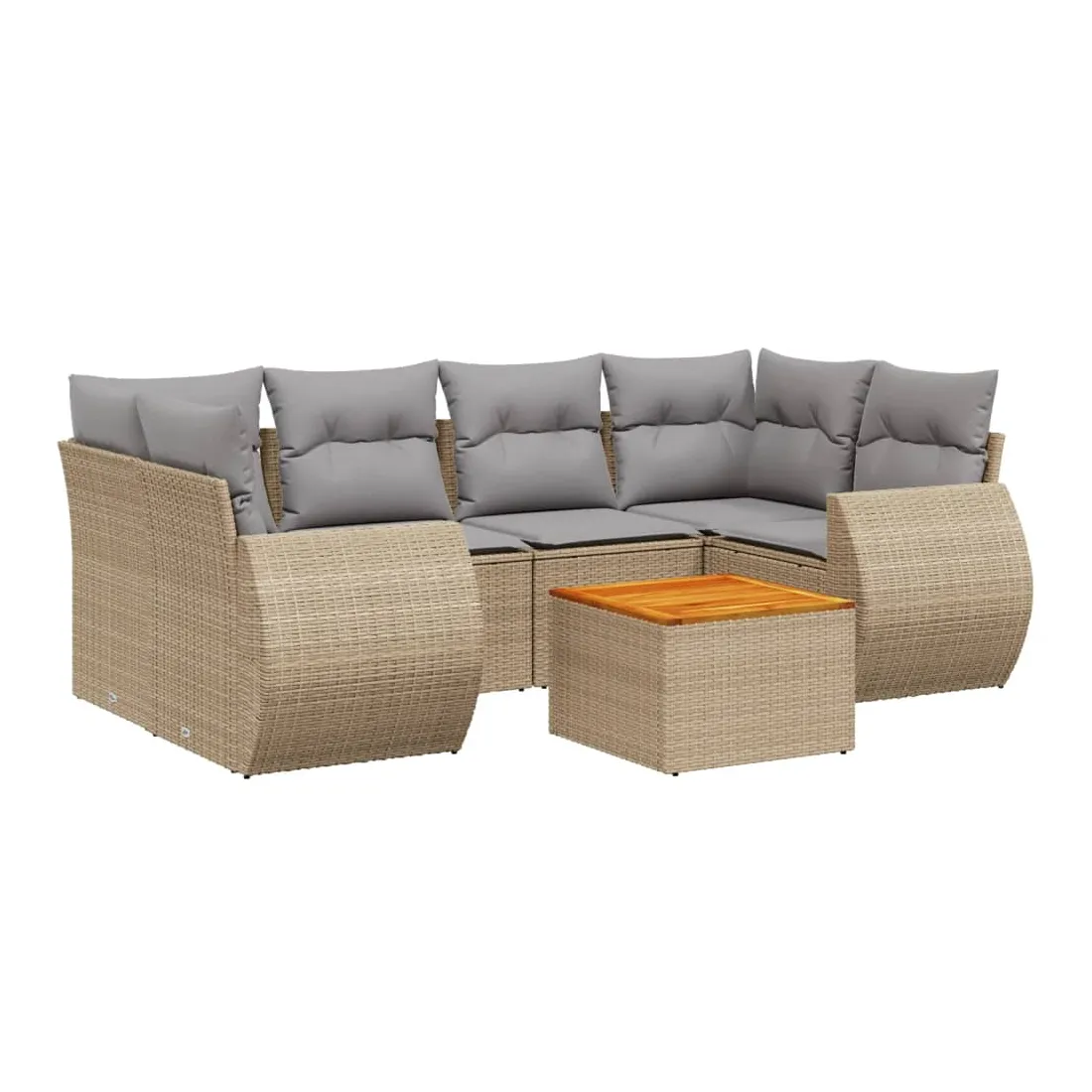 Cet ensemble de canapés de jardin est le complément parfait de votre arrière-cour, terrasse ou patio, offrant un espace confortable et accueillant pour discuter avec la famille et les amis ou simplement se détendre et profiter de l'extérieur. Matériau durable : la résine tressée, également connue sous le nom de poly rotin, est un matériau synthétique solide et nécessitant peu d'entretien qui ressemble au rotin naturel. Il est léger, facile à nettoyer et couramment utilisé pour les meubles d'extérieur en raison de sa durabilité et de ses propriétés de résistance aux intempéries.Dessus stable et facile à nettoyer : cette table de jardin a un dessus en bois d'acacia robuste, durable et facile à nettoyer avec un chiffon humide. Fonction de rangement avec sac résistant à l'eau : chaque siège de jardin dispose d'un espace de rangement sous l'assise, complété par un sac résistant à l'eau pour ranger les coussins, les jouets et d'autres objets. Les sacs intérieurs sont dotés d'un couvercle et peuvent être solidement fixés aux sièges à l'aide de bandes auto-agrippantes pour plus de stabilité.Expérience d'assise confortable : ce mobilier d'extérieur, doté de coussins épais, offre une expérience d'assise confortable.Conception modulaire : cet ensemble de meubles d'extérieur a une conception modulaire, ce qui le rend complètement flexible et facile à déplacer, afin que vous puissiez créer un agencement de meubles d'extérieur personnalisé. Bon à savoir :Pour que vos meubles d'extérieur restent beaux, nous vous recommandons de les protéger avec une housse imperméable.