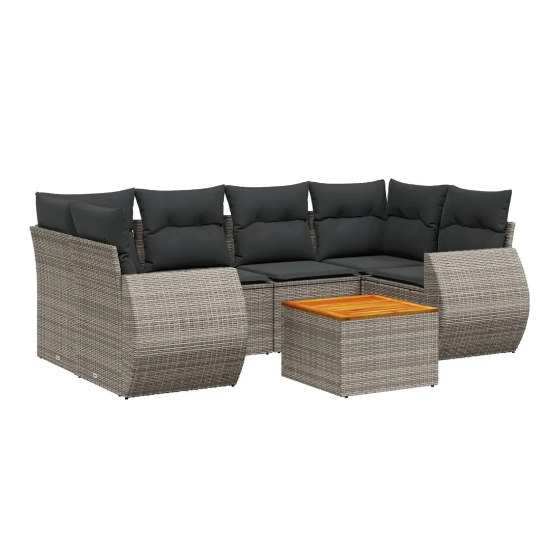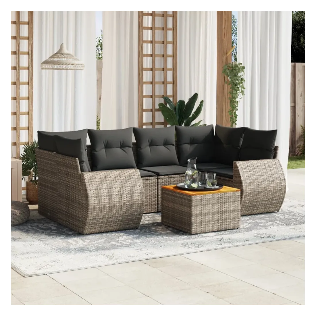 Cet ensemble de canapés de jardin est le complément parfait de votre arrière-cour, terrasse ou patio, offrant un espace confortable et accueillant pour discuter avec la famille et les amis ou simplement se détendre et profiter de l'extérieur. Matériau durable : la résine tressée, également connue sous le nom de poly rotin, est un matériau synthétique solide et nécessitant peu d'entretien qui ressemble au rotin naturel. Il est léger, facile à nettoyer et couramment utilisé pour les meubles d'extérieur en raison de sa durabilité et de ses propriétés de résistance aux intempéries.Dessus stable et facile à nettoyer : cette table de jardin a un dessus en bois d'acacia robuste, durable et facile à nettoyer avec un chiffon humide. Fonction de rangement avec sac résistant à l'eau : chaque siège de jardin dispose d'un espace de rangement sous l'assise, complété par un sac résistant à l'eau pour ranger les coussins, les jouets et d'autres objets. Les sacs intérieurs sont dotés d'un couvercle et peuvent être solidement fixés aux sièges à l'aide de bandes auto-agrippantes pour plus de stabilité.Expérience d'assise confortable : ce mobilier d'extérieur, doté de coussins épais, offre une expérience d'assise confortable.Conception modulaire : cet ensemble de meubles d'extérieur a une conception modulaire, ce qui le rend complètement flexible et facile à déplacer, afin que vous puissiez créer un agencement de meubles d'extérieur personnalisé. Bon à savoir :Pour que vos meubles d'extérieur restent beaux, nous vous recommandons de les protéger avec une housse imperméable.