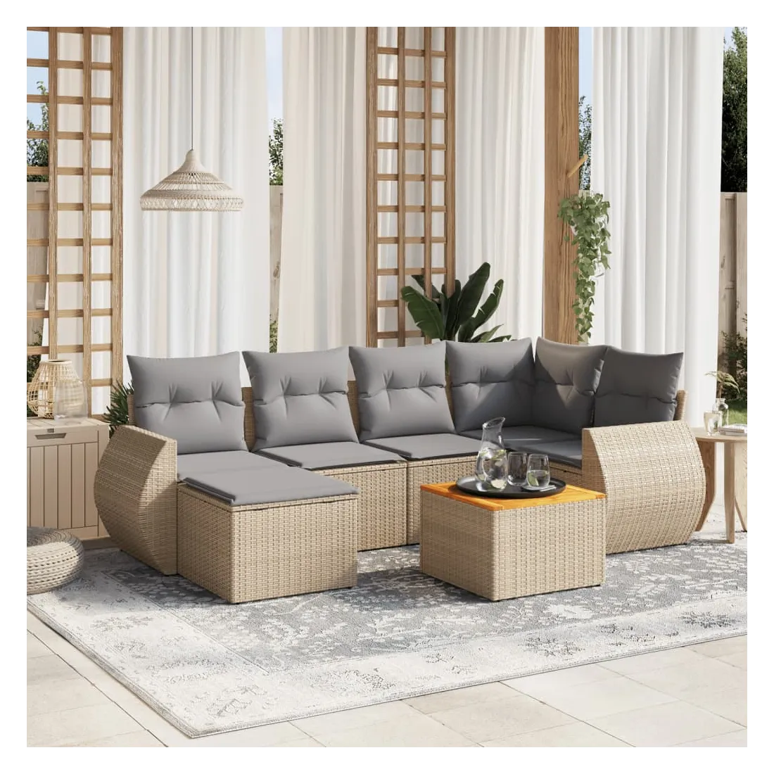 Cet ensemble de canapés de jardin est le complément parfait de votre arrière-cour, terrasse ou patio, offrant un espace confortable et accueillant pour discuter avec la famille et les amis ou simplement se détendre et profiter de l'extérieur. Matériau durable : la résine tressée, également connue sous le nom de poly rotin, est un matériau synthétique solide et nécessitant peu d'entretien qui ressemble au rotin naturel. Il est léger, facile à nettoyer et couramment utilisé pour les meubles d'extérieur en raison de sa durabilité et de ses propriétés de résistance aux intempéries.Dessus stable et facile à nettoyer : cette table de jardin a un dessus en bois d'acacia robuste, durable et facile à nettoyer avec un chiffon humide. Fonction de rangement avec sac résistant à l'eau : chaque siège de jardin dispose d'un espace de rangement sous l'assise, complété par un sac résistant à l'eau pour ranger les coussins, les jouets et d'autres objets. Les sacs intérieurs sont dotés d'un couvercle et peuvent être solidement fixés aux sièges à l'aide de bandes auto-agrippantes pour plus de stabilité.Expérience d'assise confortable : ce mobilier d'extérieur, doté de coussins épais, offre une expérience d'assise confortable.Conception modulaire : cet ensemble de meubles d'extérieur a une conception modulaire, ce qui le rend complètement flexible et facile à déplacer, afin que vous puissiez créer un agencement de meubles d'extérieur personnalisé. Bon à savoir :Pour que vos meubles d'extérieur restent beaux, nous vous recommandons de les protéger avec une housse imperméable.