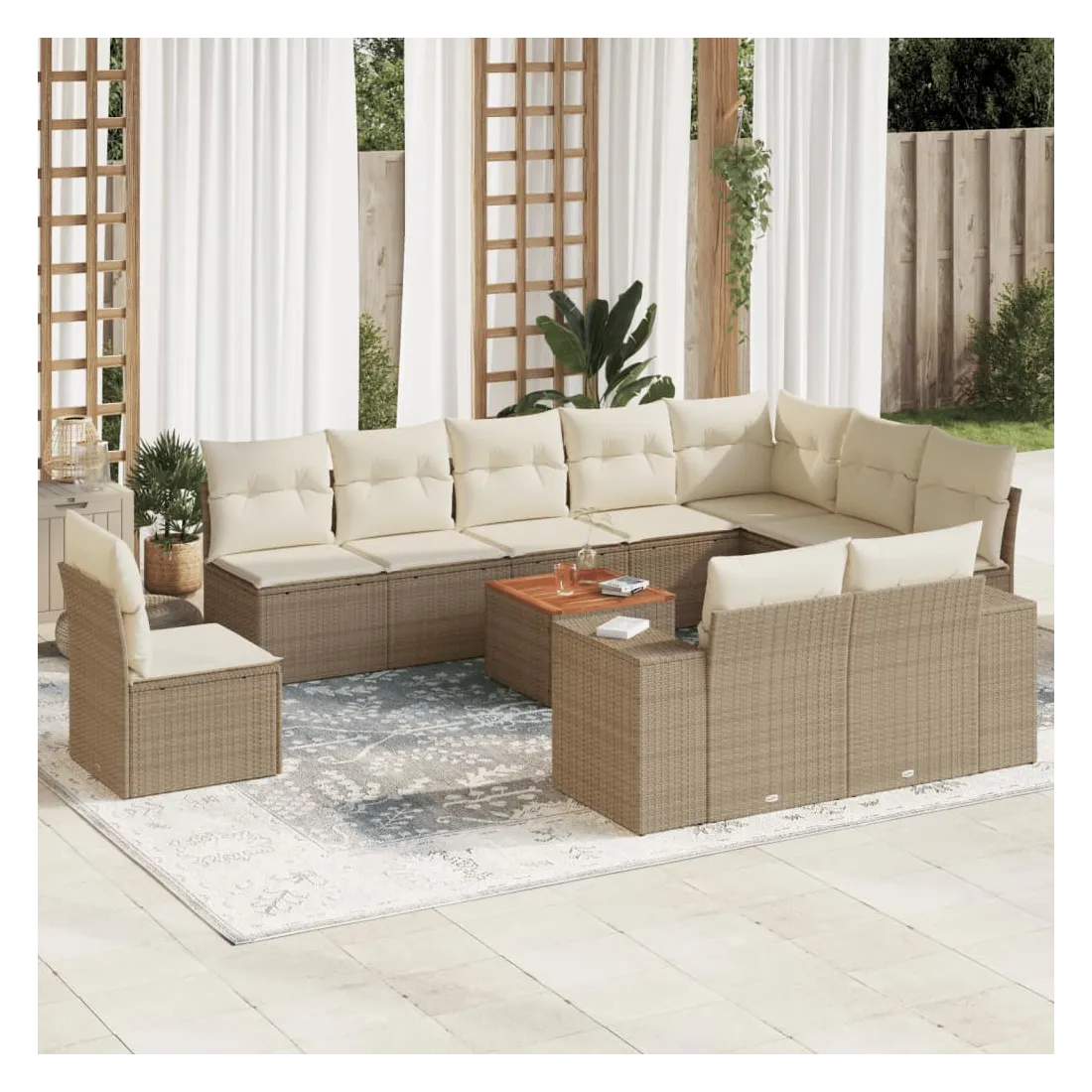 Cet ensemble de canapés de jardin est le complément parfait de votre arrière-cour, terrasse ou patio, offrant un espace confortable et accueillant pour discuter avec la famille et les amis ou simplement se détendre et profiter de l'extérieur. Matériau durable : la résine tressée, également connue sous le nom de poly rotin, est un matériau synthétique solide et nécessitant peu d'entretien qui ressemble au rotin naturel. Il est léger, facile à nettoyer et couramment utilisé pour les meubles d'extérieur en raison de sa durabilité et de ses propriétés de résistance aux intempéries. Fonction de rangement avec sac résistant à l'eau : chaque siège de jardin dispose d'un espace de rangement sous l'assise, complété par un sac résistant à l'eau pour ranger les coussins, les jouets et d'autres objets. Les sacs intérieurs sont dotés d'un couvercle et peuvent être solidement fixés aux sièges à l'aide de bandes auto-agrippantes pour plus de stabilité. Dessus stable et facile à nettoyer : cette table de jardin a un dessus en bois d'acacia robuste, durable et facile à nettoyer avec un chiffon humide. Expérience d'assise confortable : ce mobilier d'extérieur, doté de coussins épais, offre une expérience d'assise confortable. Conception modulaire : cet ensemble de meubles d'extérieur a une conception modulaire, ce qui le rend complètement flexible et facile à déplacer, afin que vous puissiez créer un agencement de meubles d'extérieur personnalisé. Bon à savoir :Pour que vos meubles d'extérieur restent beaux, nous vous recommandons de les protéger avec une housse imperméable.
