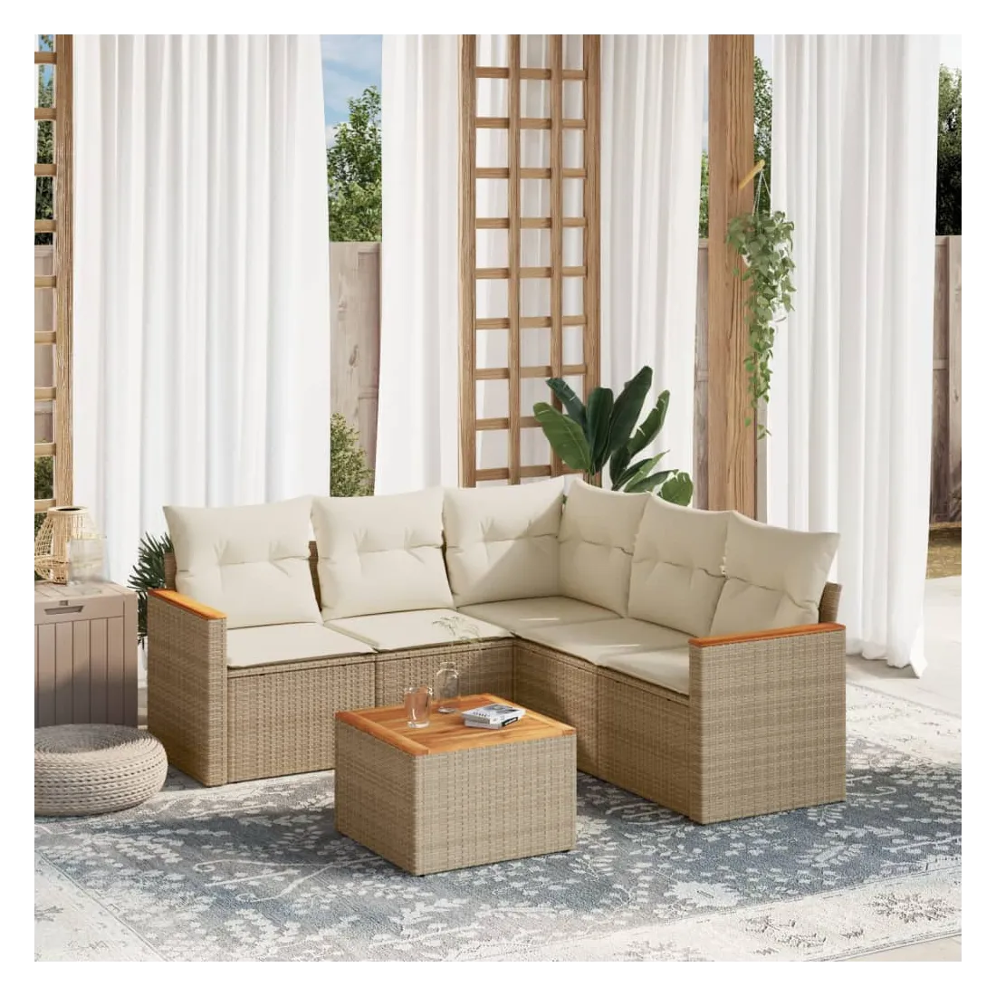 Cet ensemble de canapés de jardin est le complément parfait de votre arrière-cour, terrasse ou patio, offrant un espace confortable et accueillant pour discuter avec la famille et les amis ou simplement se détendre et profiter de l'extérieur. Matériau durable : la résine tressée, également connue sous le nom de poly rotin, est un matériau synthétique solide et nécessitant peu d'entretien qui ressemble au rotin naturel. Il est léger, facile à nettoyer et couramment utilisé pour les meubles d'extérieur en raison de sa durabilité et de ses propriétés de résistance aux intempéries.Fonction de rangement avec sac résistant à l'eau : le mobilier de jardin dispose d'un espace de rangement sous l'assise, complété par un sac résistant à l'eau pour ranger coussins, jouets et autres objets. Le sac intérieur peut être solidement fixé au mobilier d'extérieur grâce à des attaches auto-agrippantes pour plus de stabilité.Dessus stable et facile à nettoyer : cette table de jardin a un dessus en bois d'acacia robuste, durable et facile à nettoyer avec un chiffon humide.Housse amovible et lavable : ces coussins de siège sont dotés de housses amovibles pour un lavage et un entretien faciles.Conception modulaire : cet ensemble de meubles d'extérieur a une conception modulaire, ce qui le rend complètement flexible et facile à déplacer, afin que vous puissiez créer un agencement de meubles d'extérieur personnalisé. Bon à savoir :Pour que vos meubles d'extérieur restent beaux, nous vous recommandons de les protéger avec une housse imperméable.
