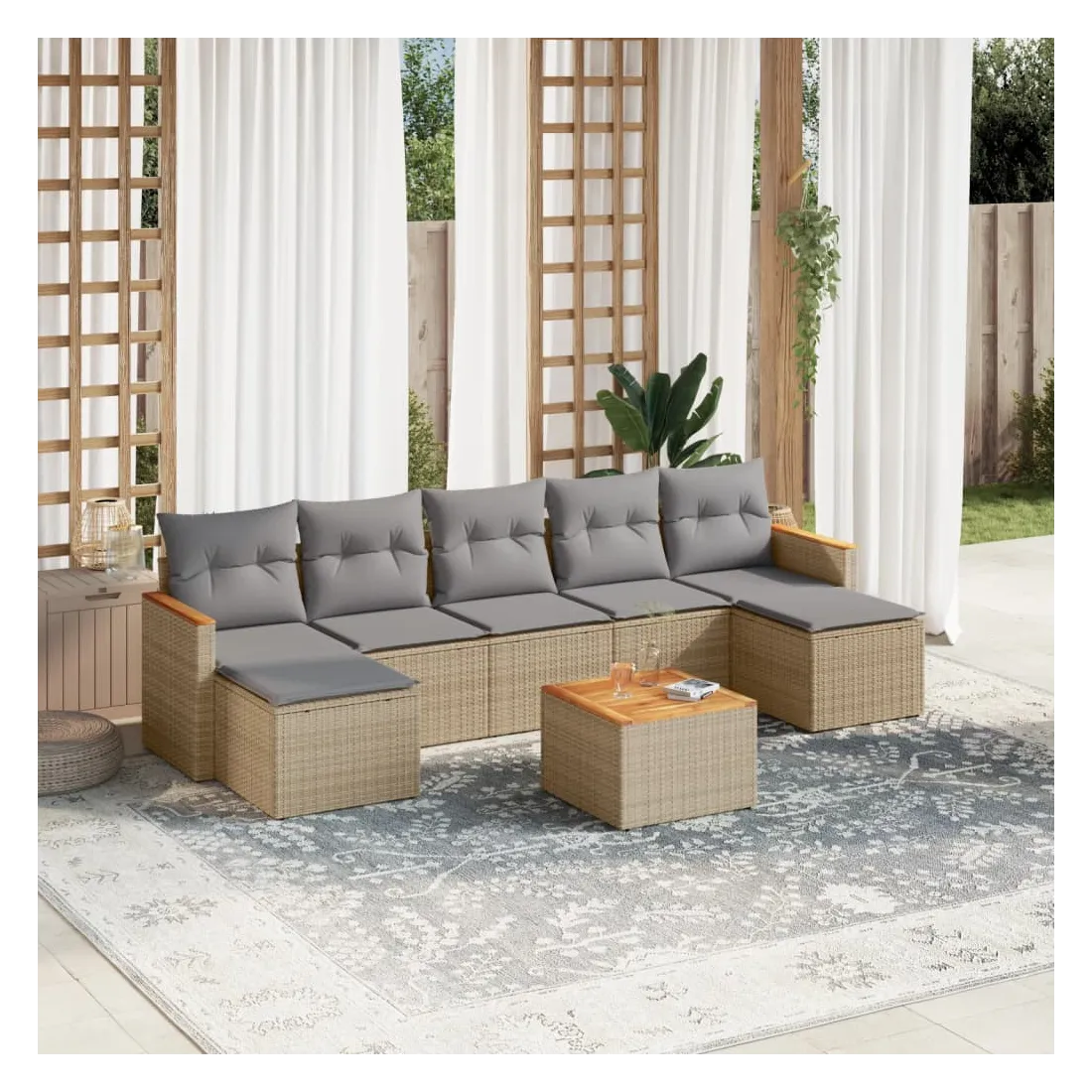 Cet ensemble de canapés de jardin est le complément parfait de votre arrière-cour, terrasse ou patio, offrant un espace confortable et accueillant pour discuter avec la famille et les amis ou simplement se détendre et profiter de l'extérieur. Matériau durable : la résine tressée, également connue sous le nom de poly rotin, est un matériau synthétique solide et nécessitant peu d'entretien qui ressemble au rotin naturel. Il est léger, facile à nettoyer et couramment utilisé pour les meubles d'extérieur en raison de sa durabilité et de ses propriétés de résistance aux intempéries.Fonction de rangement avec sac résistant à l'eau : le mobilier de jardin dispose d'un espace de rangement sous l'assise, complété par un sac résistant à l'eau pour ranger coussins, jouets et autres objets. Le sac intérieur peut être solidement fixé au mobilier d'extérieur grâce à des attaches auto-agrippantes pour plus de stabilité.Dessus stable et facile à nettoyer : cette table de jardin a un dessus en bois d'acacia robuste, durable et facile à nettoyer avec un chiffon humide.Housse amovible et lavable : ces coussins de siège sont dotés de housses amovibles pour un lavage et un entretien faciles.Conception modulaire : cet ensemble de meubles d'extérieur a une conception modulaire, ce qui le rend complètement flexible et facile à déplacer, afin que vous puissiez créer un agencement de meubles d'extérieur personnalisé. Bon à savoir :Pour que vos meubles d'extérieur restent beaux, nous vous recommandons de les protéger avec une housse imperméable.