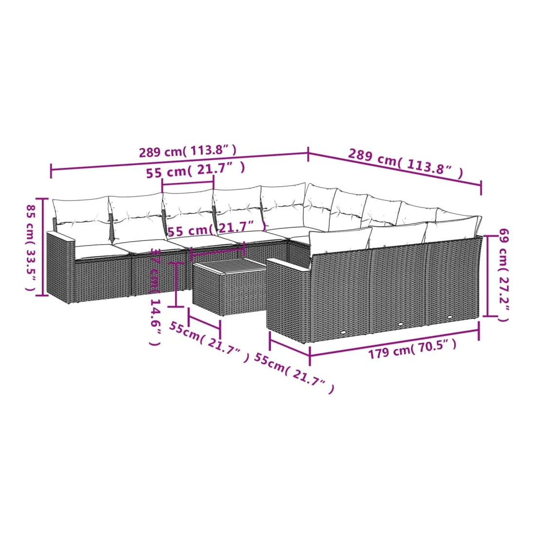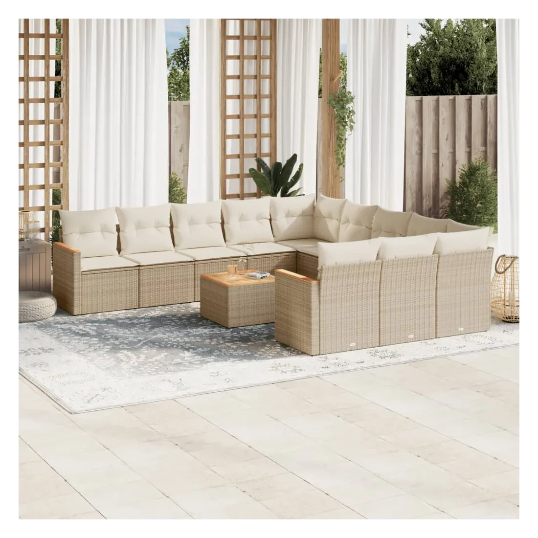 Cet ensemble de canapés de jardin est le complément parfait de votre arrière-cour, terrasse ou patio, offrant un espace confortable et accueillant pour discuter avec la famille et les amis ou simplement se détendre et profiter de l'extérieur. Matériau durable : la résine tressée, également connue sous le nom de poly rotin, est un matériau synthétique solide et nécessitant peu d'entretien qui ressemble au rotin naturel. Il est léger, facile à nettoyer et couramment utilisé pour les meubles d'extérieur en raison de sa durabilité et de ses propriétés de résistance aux intempéries.Fonction de rangement avec sac résistant à l'eau : le mobilier de jardin dispose d'un espace de rangement sous l'assise, complété par un sac résistant à l'eau pour ranger coussins, jouets et autres objets. Le sac intérieur peut être solidement fixé au mobilier d'extérieur grâce à des attaches auto-agrippantes pour plus de stabilité.Dessus stable et facile à nettoyer : cette table de jardin a un dessus en bois d'acacia robuste, durable et facile à nettoyer avec un chiffon humide.Housse amovible et lavable : ces coussins de siège sont dotés de housses amovibles pour un lavage et un entretien faciles.Conception modulaire : cet ensemble de meubles d'extérieur a une conception modulaire, ce qui le rend complètement flexible et facile à déplacer, afin que vous puissiez créer un agencement de meubles d'extérieur personnalisé. Bon à savoir :Pour que vos meubles d'extérieur restent beaux, nous vous recommandons de les protéger avec une housse imperméable.