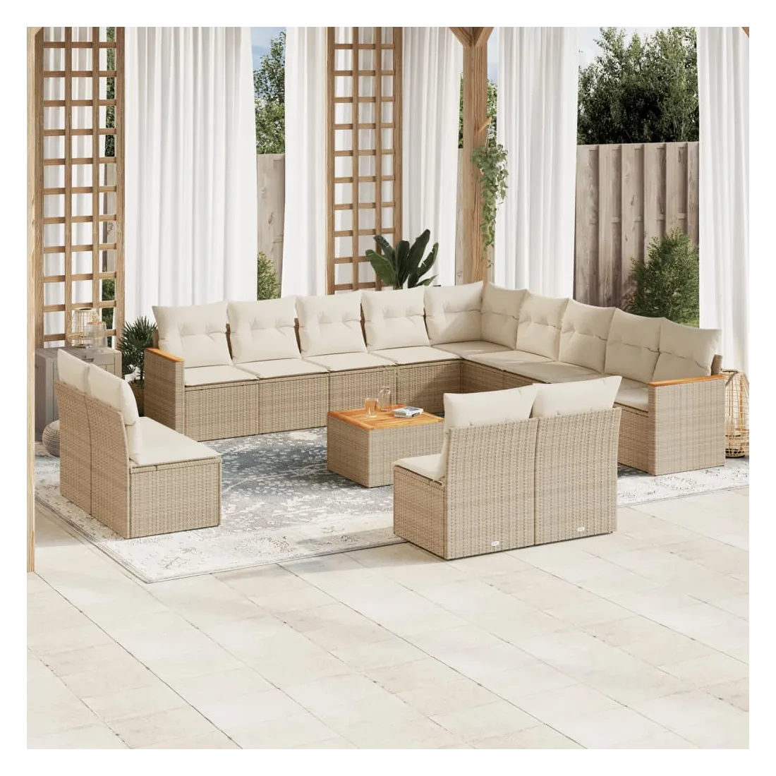 Cet ensemble de canapés de jardin est le complément parfait de votre arrière-cour, terrasse ou patio, offrant un espace confortable et accueillant pour discuter avec la famille et les amis ou simplement se détendre et profiter de l'extérieur. Matériau durable : la résine tressée, également connue sous le nom de poly rotin, est un matériau synthétique solide et nécessitant peu d'entretien qui ressemble au rotin naturel. Il est léger, facile à nettoyer et couramment utilisé pour les meubles d'extérieur en raison de sa durabilité et de ses propriétés de résistance aux intempéries.Fonction de rangement avec sac résistant à l'eau : le mobilier de jardin dispose d'un espace de rangement sous l'assise, complété par un sac résistant à l'eau pour ranger coussins, jouets et autres objets. Le sac intérieur peut être solidement fixé au mobilier d'extérieur grâce à des attaches auto-agrippantes pour plus de stabilité.Dessus stable et facile à nettoyer : cette table de jardin a un dessus en bois d'acacia robuste, durable et facile à nettoyer avec un chiffon humide.Housse amovible et lavable : ces coussins de siège sont dotés de housses amovibles pour un lavage et un entretien faciles.Conception modulaire : cet ensemble de meubles d'extérieur a une conception modulaire, ce qui le rend complètement flexible et facile à déplacer, afin que vous puissiez créer un agencement de meubles d'extérieur personnalisé. Bon à savoir :Pour que vos meubles d'extérieur restent beaux, nous vous recommandons de les protéger avec une housse imperméable.