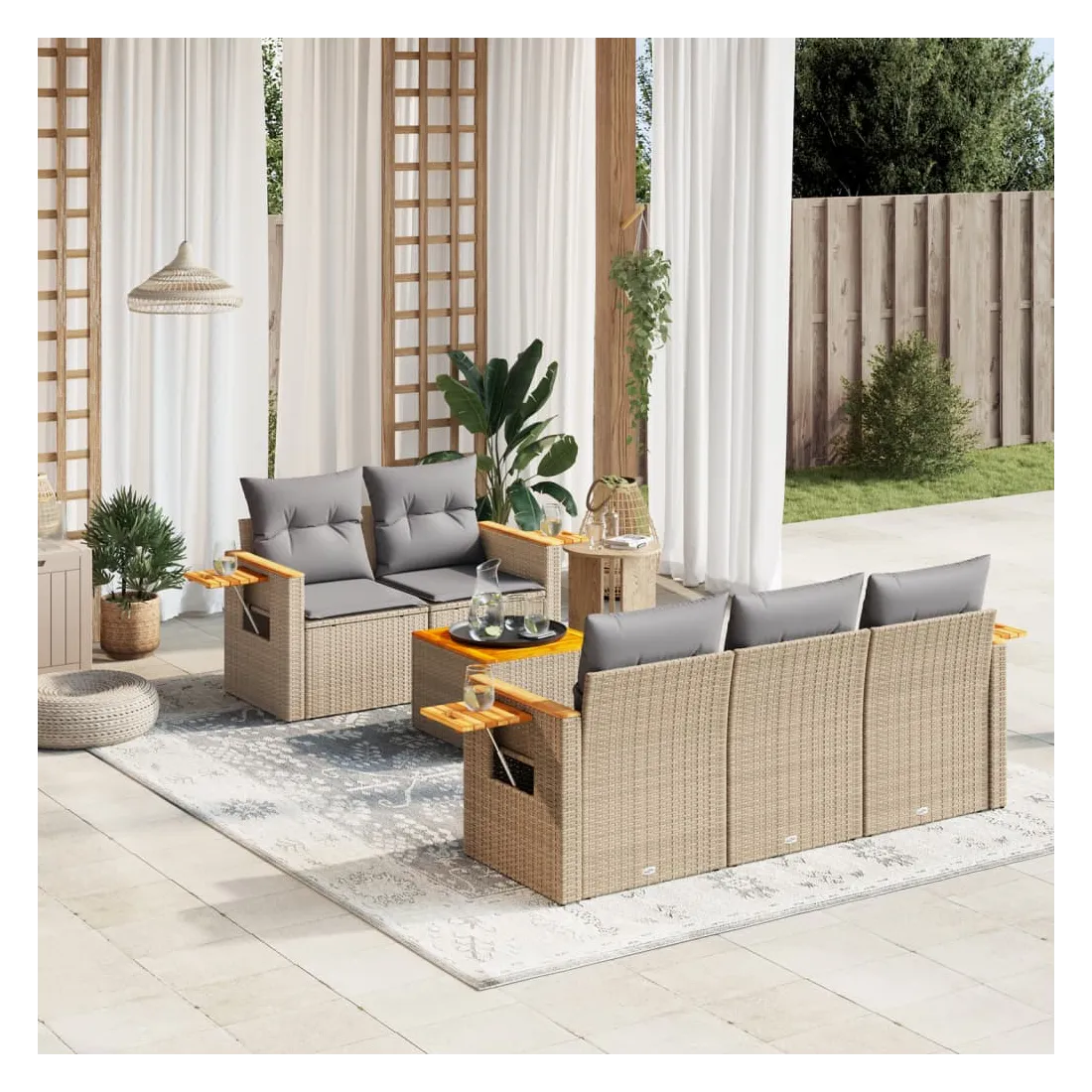 Cet ensemble de canapés de jardin est le complément parfait de votre arrière-cour, terrasse ou patio, offrant un espace confortable et accueillant pour discuter avec la famille et les amis ou simplement se détendre et profiter de l'extérieur. Matériau durable : la résine tressée, également connue sous le nom de poly rotin, est un matériau synthétique solide et nécessitant peu d'entretien qui ressemble au rotin naturel. Il est léger, facile à nettoyer et couramment utilisé pour les meubles d'extérieur en raison de sa durabilité et de ses propriétés de résistance aux intempéries.Fonction de rangement avec sac résistant à l'eau : le mobilier de jardin dispose d'un espace de rangement sous l'assise, complété par un sac résistant à l'eau pour ranger coussins, jouets et autres objets. Le sac intérieur peut être solidement fixé au mobilier d'extérieur grâce à des attaches auto-agrippantes pour plus de stabilité.Table d'appoint pratique : ce mobilier d'extérieur comprend une table d'appoint pliable avec un ressort à gaz sur les accoudoirs, offrant un endroit pratique pour garder vos essentiels à portée de main.Housse amovible et lavable : ces coussins de siège sont dotés de housses amovibles pour un lavage et un entretien faciles.Conception modulaire : cet ensemble de meubles d'extérieur a une conception modulaire, ce qui le rend complètement flexible et facile à déplacer, afin que vous puissiez créer un agencement de meubles d'extérieur personnalisé. Bon à savoir :Pour que vos meubles d'extérieur restent beaux, nous vous recommandons de les protéger avec une housse imperméable.
