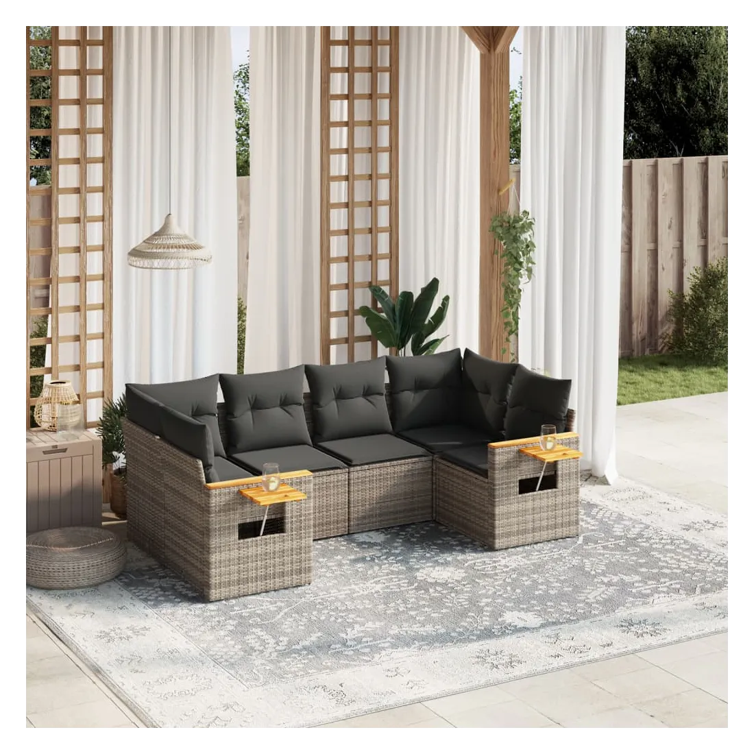 Cet ensemble de canapés de jardin est le complément parfait de votre arrière-cour, terrasse ou patio, offrant un espace confortable et accueillant pour discuter avec la famille et les amis ou simplement se détendre et profiter de l'extérieur. Matériau durable : la résine tressée, également connue sous le nom de poly rotin, est un matériau synthétique solide et nécessitant peu d'entretien qui ressemble au rotin naturel. Il est léger, facile à nettoyer et couramment utilisé pour les meubles d'extérieur en raison de sa durabilité et de ses propriétés de résistance aux intempéries.Fonction de rangement avec sac résistant à l'eau : le mobilier de jardin dispose d'un espace de rangement sous l'assise, complété par un sac résistant à l'eau pour ranger coussins, jouets et autres objets. Le sac intérieur peut être solidement fixé au mobilier d'extérieur grâce à des attaches auto-agrippantes pour plus de stabilité.Table d'appoint pratique : ce mobilier d'extérieur comprend une table d'appoint pliable avec un ressort à gaz sur les accoudoirs, offrant un endroit pratique pour garder vos essentiels à portée de main.Housse amovible et lavable : ces coussins de siège sont dotés de housses amovibles pour un lavage et un entretien faciles.Conception modulaire : cet ensemble de meubles d'extérieur a une conception modulaire, ce qui le rend complètement flexible et facile à déplacer, afin que vous puissiez créer un agencement de meubles d'extérieur personnalisé. Bon à savoir :Pour que vos meubles d'extérieur restent beaux, nous vous recommandons de les protéger avec une housse imperméable.