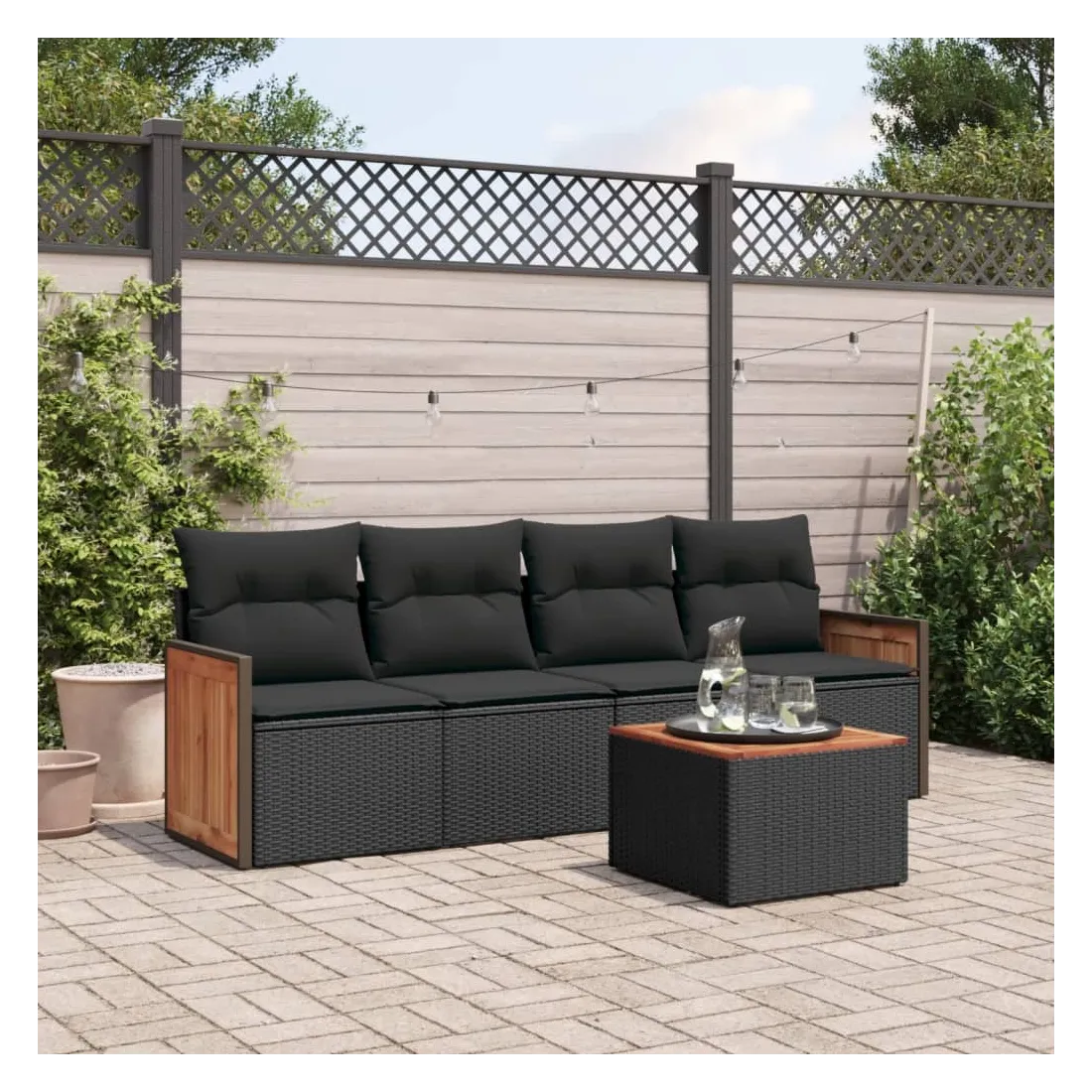 Cet ensemble de canapés de jardin est le complément parfait de votre arrière-cour, terrasse ou patio, offrant un espace confortable et accueillant pour discuter avec la famille et les amis ou simplement se détendre et profiter de l'extérieur. Matériau durable : la résine tressée, également connue sous le nom de poly rotin, est un matériau synthétique solide et nécessitant peu d'entretien qui ressemble au rotin naturel. Il est léger, facile à nettoyer et couramment utilisé pour les meubles d'extérieur en raison de sa durabilité et de ses propriétés de résistance aux intempéries.Fonction de rangement avec sac résistant à l'eau : le mobilier de jardin dispose d'un espace de rangement sous l'assise, complété par un sac résistant à l'eau pour ranger coussins, jouets et autres objets. Le sac intérieur peut être solidement fixé au mobilier d'extérieur grâce à des attaches auto-agrippantes pour plus de stabilité.Dessus stable et facile à nettoyer : cette table de jardin a un dessus en bois d'acacia robuste, durable et facile à nettoyer avec un chiffon humide.Housse amovible et lavable : ces coussins de siège sont dotés de housses amovibles pour un lavage et un entretien faciles.Conception modulaire : cet ensemble de meubles d'extérieur a une conception modulaire, ce qui le rend complètement flexible et facile à déplacer, afin que vous puissiez créer un agencement de meubles d'extérieur personnalisé. Bon à savoir :Pour que vos meubles d'extérieur restent beaux, nous vous recommandons de les protéger avec une housse imperméable.