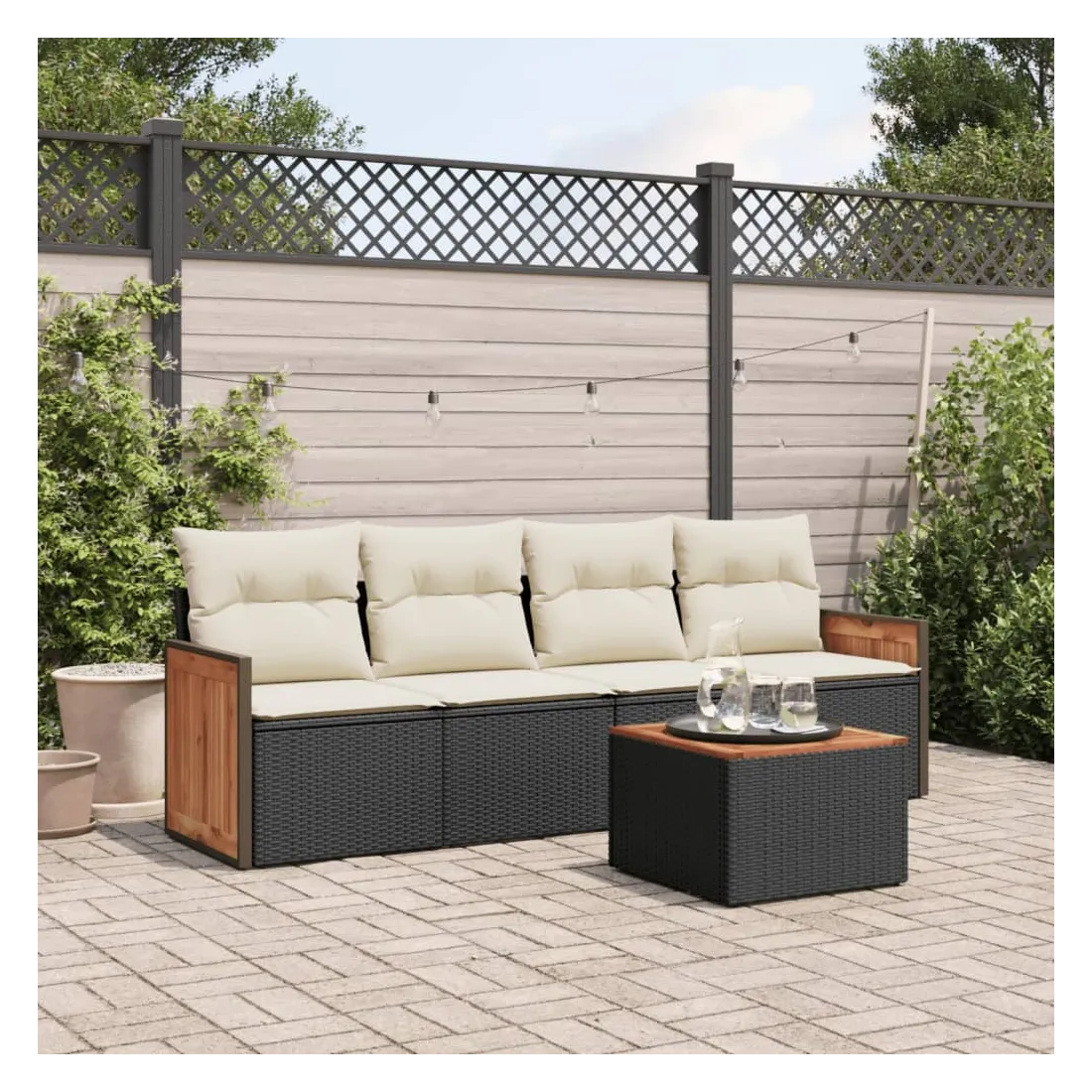 Cet ensemble de canapés de jardin est le complément parfait de votre arrière-cour, terrasse ou patio, offrant un espace confortable et accueillant pour discuter avec la famille et les amis ou simplement se détendre et profiter de l'extérieur. Matériau durable : la résine tressée, également connue sous le nom de poly rotin, est un matériau synthétique solide et nécessitant peu d'entretien qui ressemble au rotin naturel. Il est léger, facile à nettoyer et couramment utilisé pour les meubles d'extérieur en raison de sa durabilité et de ses propriétés de résistance aux intempéries.Fonction de rangement avec sac résistant à l'eau : le mobilier de jardin dispose d'un espace de rangement sous l'assise, complété par un sac résistant à l'eau pour ranger coussins, jouets et autres objets. Le sac intérieur peut être solidement fixé au mobilier d'extérieur grâce à des attaches auto-agrippantes pour plus de stabilité.Dessus stable et facile à nettoyer : cette table de jardin a un dessus en bois d'acacia robuste, durable et facile à nettoyer avec un chiffon humide.Housse amovible et lavable : ces coussins de siège sont dotés de housses amovibles pour un lavage et un entretien faciles.Conception modulaire : cet ensemble de meubles d'extérieur a une conception modulaire, ce qui le rend complètement flexible et facile à déplacer, afin que vous puissiez créer un agencement de meubles d'extérieur personnalisé. Bon à savoir :Pour que vos meubles d'extérieur restent beaux, nous vous recommandons de les protéger avec une housse imperméable.