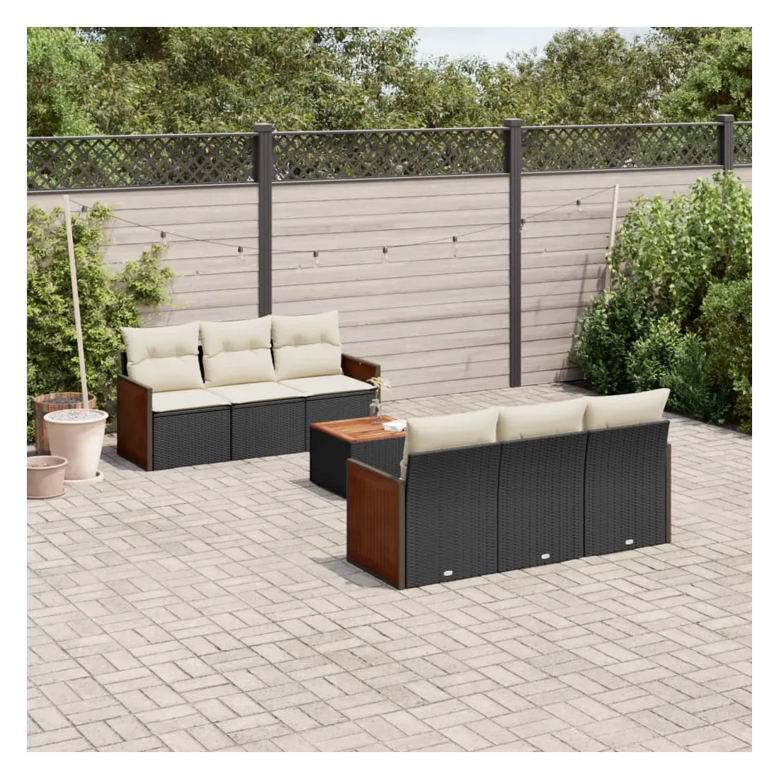 Cet ensemble de canapés de jardin est le complément parfait de votre arrière-cour, terrasse ou patio, offrant un espace confortable et accueillant pour discuter avec la famille et les amis ou simplement se détendre et profiter de l'extérieur. Matériau durable : la résine tressée, également connue sous le nom de poly rotin, est un matériau synthétique solide et nécessitant peu d'entretien qui ressemble au rotin naturel. Il est léger, facile à nettoyer et couramment utilisé pour les meubles d'extérieur en raison de sa durabilité et de ses propriétés de résistance aux intempéries.Fonction de rangement avec sac résistant à l'eau : le mobilier de jardin dispose d'un espace de rangement sous l'assise, complété par un sac résistant à l'eau pour ranger coussins, jouets et autres objets. Le sac intérieur peut être solidement fixé au mobilier d'extérieur grâce à des attaches auto-agrippantes pour plus de stabilité.Dessus stable et facile à nettoyer : cette table de jardin a un dessus en bois d'acacia robuste, durable et facile à nettoyer avec un chiffon humide.Housse amovible et lavable : ces coussins de siège sont dotés de housses amovibles pour un lavage et un entretien faciles.Conception modulaire : cet ensemble de meubles d'extérieur a une conception modulaire, ce qui le rend complètement flexible et facile à déplacer, afin que vous puissiez créer un agencement de meubles d'extérieur personnalisé. Bon à savoir :Pour que vos meubles d'extérieur restent beaux, nous vous recommandons de les protéger avec une housse imperméable.