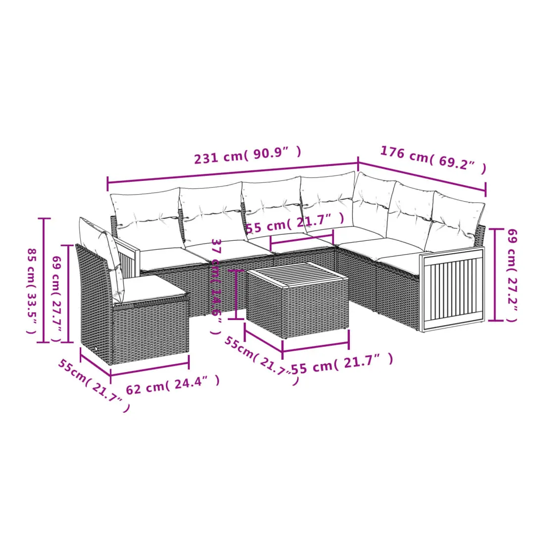 Cet ensemble de canapés de jardin est le complément parfait de votre arrière-cour, terrasse ou patio, offrant un espace confortable et accueillant pour discuter avec la famille et les amis ou simplement se détendre et profiter de l'extérieur. Matériau durable : la résine tressée, également connue sous le nom de poly rotin, est un matériau synthétique solide et nécessitant peu d'entretien qui ressemble au rotin naturel. Il est léger, facile à nettoyer et couramment utilisé pour les meubles d'extérieur en raison de sa durabilité et de ses propriétés de résistance aux intempéries.Fonction de rangement avec sac résistant à l'eau : le mobilier de jardin dispose d'un espace de rangement sous l'assise, complété par un sac résistant à l'eau pour ranger coussins, jouets et autres objets. Le sac intérieur peut être solidement fixé au mobilier d'extérieur grâce à des attaches auto-agrippantes pour plus de stabilité.Dessus stable et facile à nettoyer : cette table de jardin a un dessus en bois d'acacia robuste, durable et facile à nettoyer avec un chiffon humide.Housse amovible et lavable : ces coussins de siège sont dotés de housses amovibles pour un lavage et un entretien faciles.Conception modulaire : cet ensemble de meubles d'extérieur a une conception modulaire, ce qui le rend complètement flexible et facile à déplacer, afin que vous puissiez créer un agencement de meubles d'extérieur personnalisé. Bon à savoir :Pour que vos meubles d'extérieur restent beaux, nous vous recommandons de les protéger avec une housse imperméable.