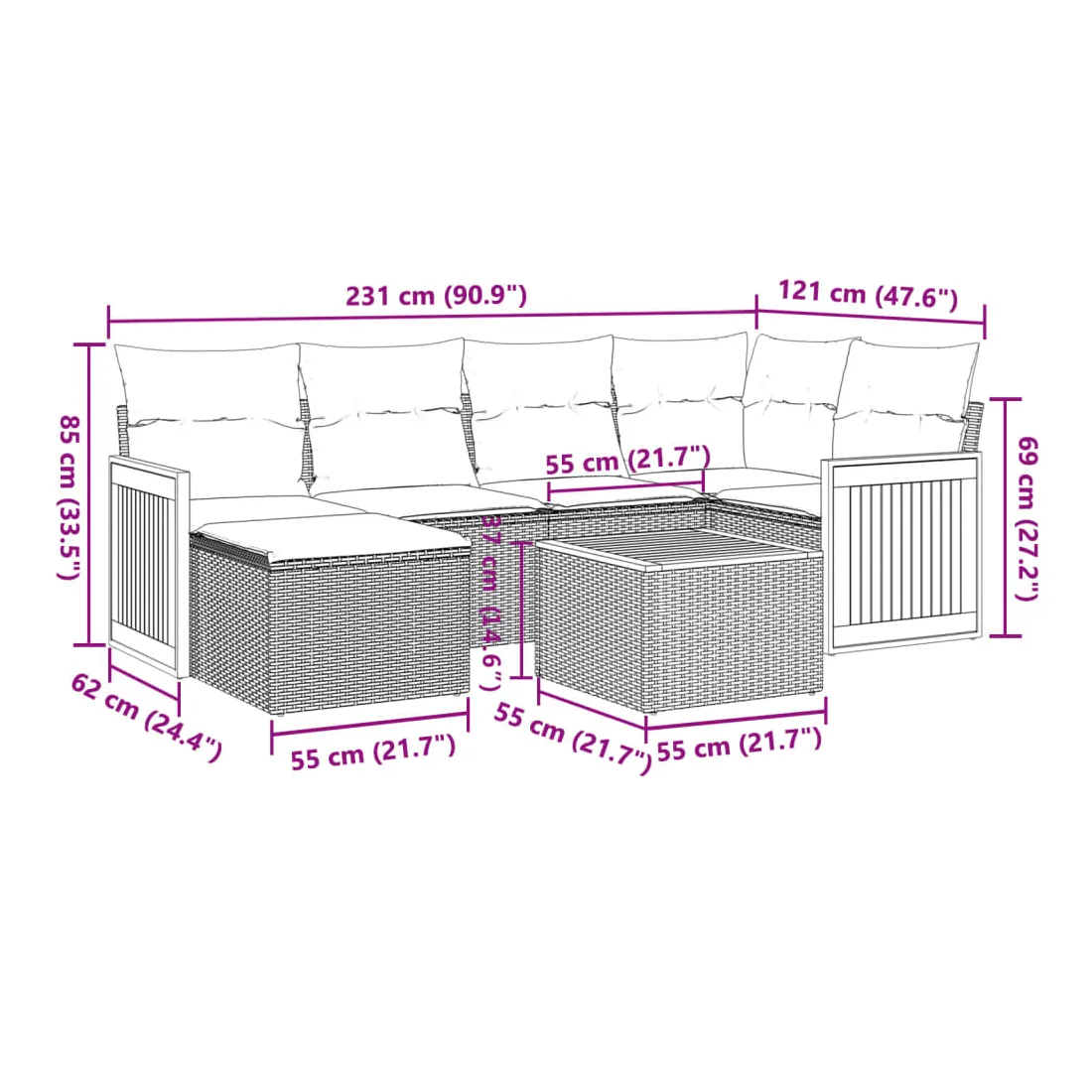Cet ensemble de canapés de jardin est le complément parfait de votre arrière-cour, terrasse ou patio, offrant un espace confortable et accueillant pour discuter avec la famille et les amis ou simplement se détendre et profiter de l'extérieur. Matériau durable : la résine tressée, également connue sous le nom de poly rotin, est un matériau synthétique solide et nécessitant peu d'entretien qui ressemble au rotin naturel. Il est léger, facile à nettoyer et couramment utilisé pour les meubles d'extérieur en raison de sa durabilité et de ses propriétés de résistance aux intempéries.Fonction de rangement avec sac résistant à l'eau : le mobilier de jardin dispose d'un espace de rangement sous l'assise, complété par un sac résistant à l'eau pour ranger coussins, jouets et autres objets. Le sac intérieur peut être solidement fixé au mobilier d'extérieur grâce à des attaches auto-agrippantes pour plus de stabilité.Dessus stable et facile à nettoyer : cette table de jardin a un dessus en bois d'acacia robuste, durable et facile à nettoyer avec un chiffon humide.Housse amovible et lavable : ces coussins de siège sont dotés de housses amovibles pour un lavage et un entretien faciles.Conception modulaire : cet ensemble de meubles d'extérieur a une conception modulaire, ce qui le rend complètement flexible et facile à déplacer, afin que vous puissiez créer un agencement de meubles d'extérieur personnalisé. Bon à savoir :Pour que vos meubles d'extérieur restent beaux, nous vous recommandons de les protéger avec une housse imperméable.