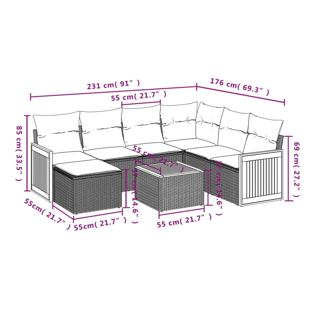 Cet ensemble de canapés de jardin est le complément parfait de votre arrière-cour, terrasse ou patio, offrant un espace confortable et accueillant pour discuter avec la famille et les amis ou simplement se détendre et profiter de l'extérieur. Matériau durable : la résine tressée, également connue sous le nom de poly rotin, est un matériau synthétique solide et nécessitant peu d'entretien qui ressemble au rotin naturel. Il est léger, facile à nettoyer et couramment utilisé pour les meubles d'extérieur en raison de sa durabilité et de ses propriétés de résistance aux intempéries.Fonction de rangement avec sac résistant à l'eau : le mobilier de jardin dispose d'un espace de rangement sous l'assise, complété par un sac résistant à l'eau pour ranger coussins, jouets et autres objets. Le sac intérieur peut être solidement fixé au mobilier d'extérieur grâce à des attaches auto-agrippantes pour plus de stabilité.Dessus stable et facile à nettoyer : cette table de jardin a un dessus en bois d'acacia robuste, durable et facile à nettoyer avec un chiffon humide.Housse amovible et lavable : ces coussins de siège sont dotés de housses amovibles pour un lavage et un entretien faciles.Conception modulaire : cet ensemble de meubles d'extérieur a une conception modulaire, ce qui le rend complètement flexible et facile à déplacer, afin que vous puissiez créer un agencement de meubles d'extérieur personnalisé. Bon à savoir :Pour que vos meubles d'extérieur restent beaux, nous vous recommandons de les protéger avec une housse imperméable.