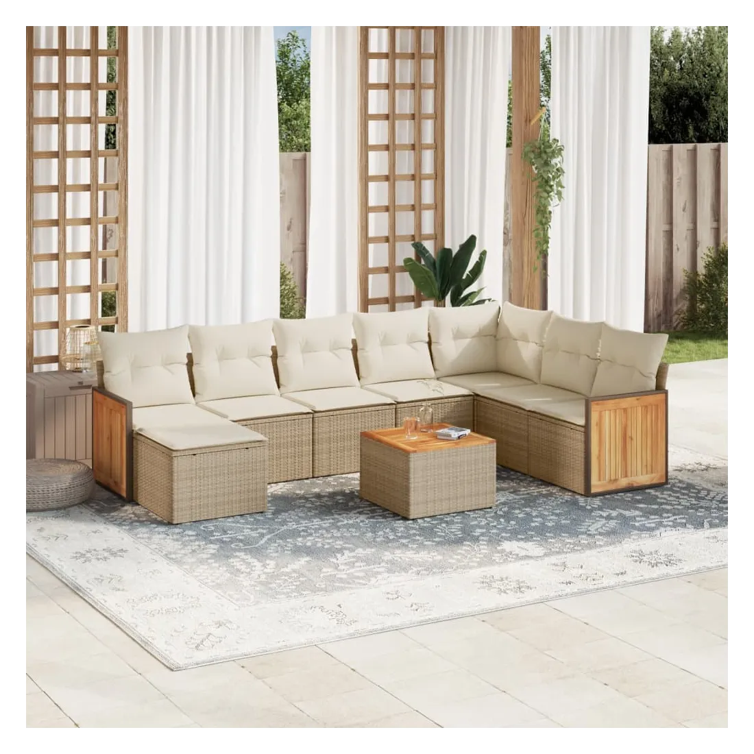 Cet ensemble de canapés de jardin est le complément parfait de votre arrière-cour, terrasse ou patio, offrant un espace confortable et accueillant pour discuter avec la famille et les amis ou simplement se détendre et profiter de l'extérieur. Matériau durable : la résine tressée, également connue sous le nom de poly rotin, est un matériau synthétique solide et nécessitant peu d'entretien qui ressemble au rotin naturel. Il est léger, facile à nettoyer et couramment utilisé pour les meubles d'extérieur en raison de sa durabilité et de ses propriétés de résistance aux intempéries.Fonction de rangement avec sac résistant à l'eau : le mobilier de jardin dispose d'un espace de rangement sous l'assise, complété par un sac résistant à l'eau pour ranger coussins, jouets et autres objets. Le sac intérieur peut être solidement fixé au mobilier d'extérieur grâce à des attaches auto-agrippantes pour plus de stabilité.Dessus stable et facile à nettoyer : cette table de jardin a un dessus en bois d'acacia robuste, durable et facile à nettoyer avec un chiffon humide.Housse amovible et lavable : ces coussins de siège sont dotés de housses amovibles pour un lavage et un entretien faciles.Conception modulaire : cet ensemble de meubles d'extérieur a une conception modulaire, ce qui le rend complètement flexible et facile à déplacer, afin que vous puissiez créer un agencement de meubles d'extérieur personnalisé. Bon à savoir :Pour que vos meubles d'extérieur restent beaux, nous vous recommandons de les protéger avec une housse imperméable.