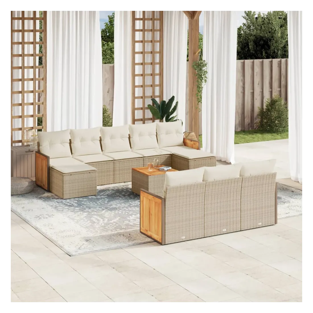 Cet ensemble de canapés de jardin est le complément parfait de votre arrière-cour, terrasse ou patio, offrant un espace confortable et accueillant pour discuter avec la famille et les amis ou simplement se détendre et profiter de l'extérieur. Matériau durable : la résine tressée, également connue sous le nom de poly rotin, est un matériau synthétique solide et nécessitant peu d'entretien qui ressemble au rotin naturel. Il est léger, facile à nettoyer et couramment utilisé pour les meubles d'extérieur en raison de sa durabilité et de ses propriétés de résistance aux intempéries.Fonction de rangement avec sac résistant à l'eau : le mobilier de jardin dispose d'un espace de rangement sous l'assise, complété par un sac résistant à l'eau pour ranger coussins, jouets et autres objets. Le sac intérieur peut être solidement fixé au mobilier d'extérieur grâce à des attaches auto-agrippantes pour plus de stabilité.Dessus stable et facile à nettoyer : cette table de jardin a un dessus en bois d'acacia robuste, durable et facile à nettoyer avec un chiffon humide.Housse amovible et lavable : ces coussins de siège sont dotés de housses amovibles pour un lavage et un entretien faciles.Conception modulaire : cet ensemble de meubles d'extérieur a une conception modulaire, ce qui le rend complètement flexible et facile à déplacer, afin que vous puissiez créer un agencement de meubles d'extérieur personnalisé. Bon à savoir :Pour que vos meubles d'extérieur restent beaux, nous vous recommandons de les protéger avec une housse imperméable.