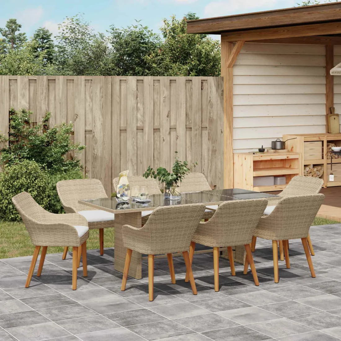 Cet ensemble de salle à manger de jardin stylé est parfait pour améliorer vos moments dehors tout en ajoutant une touche de confort. Super pour les jardins et terrasses, il combine un design moderne avec des aspects pratiques pour créer un coin repas sympa pour vos soirées en plein air. Avec ses lignes simples et son style minimaliste, cet ensemble s’adapte à plein de thèmes décoratifs tout en offrant confort et performance. Son design séduisant et sa nature accueillante en font un choix populaire pour les propriétaires qui cherchent une solution agréable mais classe pour manger à l'extérieur. Matériaux de qualité supérieure L'ensemble de salle à manger est entièrement construit en Poly Rattan, connu pour sa solidité et son allure esthétique. La résistance aux UV du matériau permet une durabilité, gardant sa couleur éclatante même au soleil. L'acier est recouvert de poudre pour plus de solidité, créant un cadre qui résiste facilement aux intempéries. Ensemble complet Chaque siège a un dossier confortable et des accoudoirs en Poly Rattan, offrant un confort ergonomique pour vos repas. Tous les éléments, des sièges au cadre de la table, créent une ambiance agréable pour discuter et se détendre. Fonctionnalité moderne Les lignes modernes et épurées de l'ensemble de salle à manger combinent simplicité et raffinement. Sa conception adaptable le rend parfait pour les espaces extérieurs contemporains tout en restant fonctionnel sans être compliqué. Il représente l'essence du design de meubles tendance. Usages polyvalents Parfait pour des déjeuners en plein air, des rencontres décontractées ou même un café tranquille en solo. Il passe facilement de dîners intimes à un coin reposant, s'adaptant à toutes les occasions et états d'esprit. La polyvalence de cet ensemble souligne sa grande valeur. Entretien simple Garder ce mobilier en bon état est facile : un coup de chiffon humide suffit. Un entretien régulier prolongera la durée de vie et maintiendra son look impeccable, offrant une grande praticité à l'utilisateur.