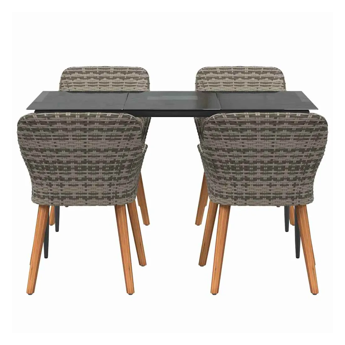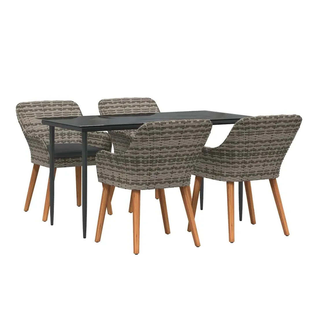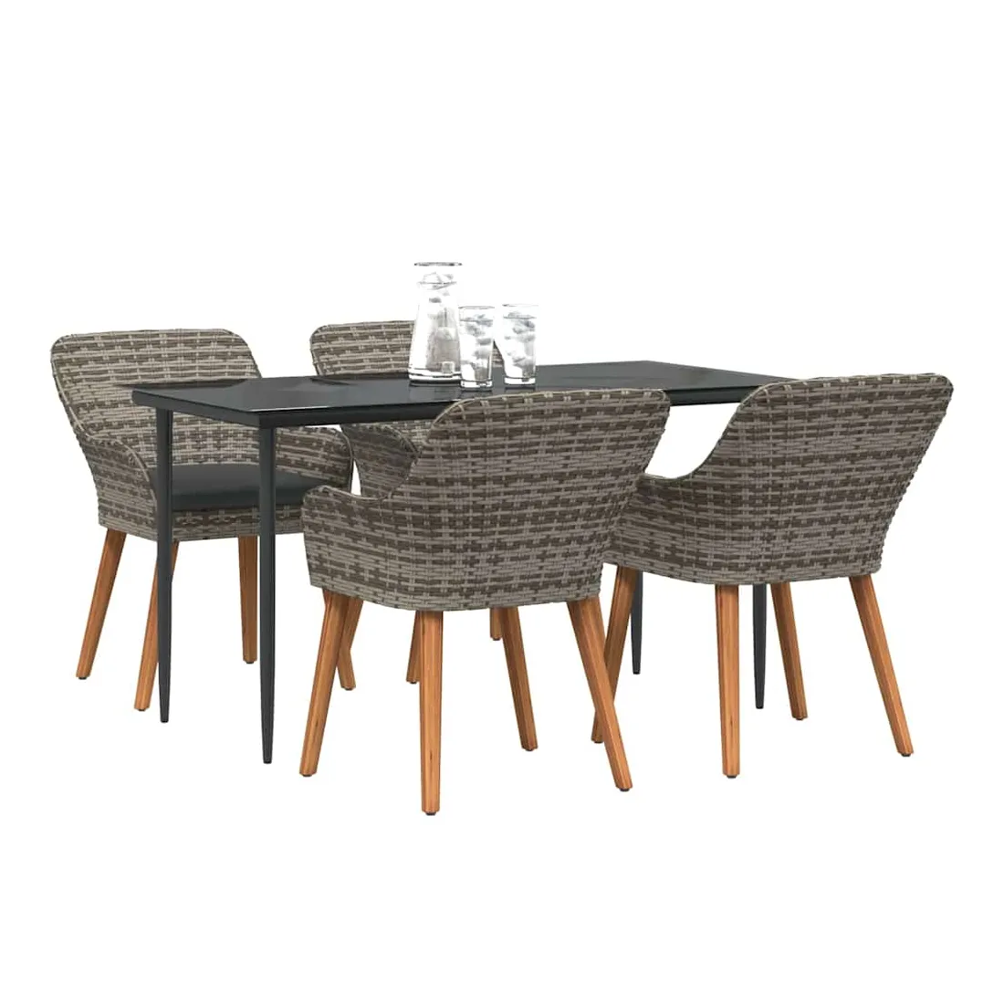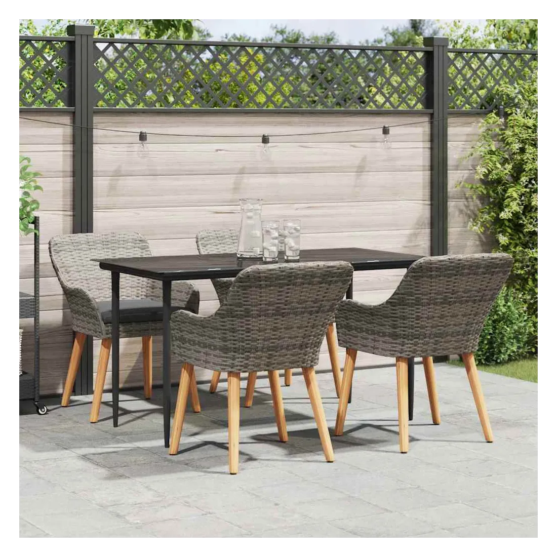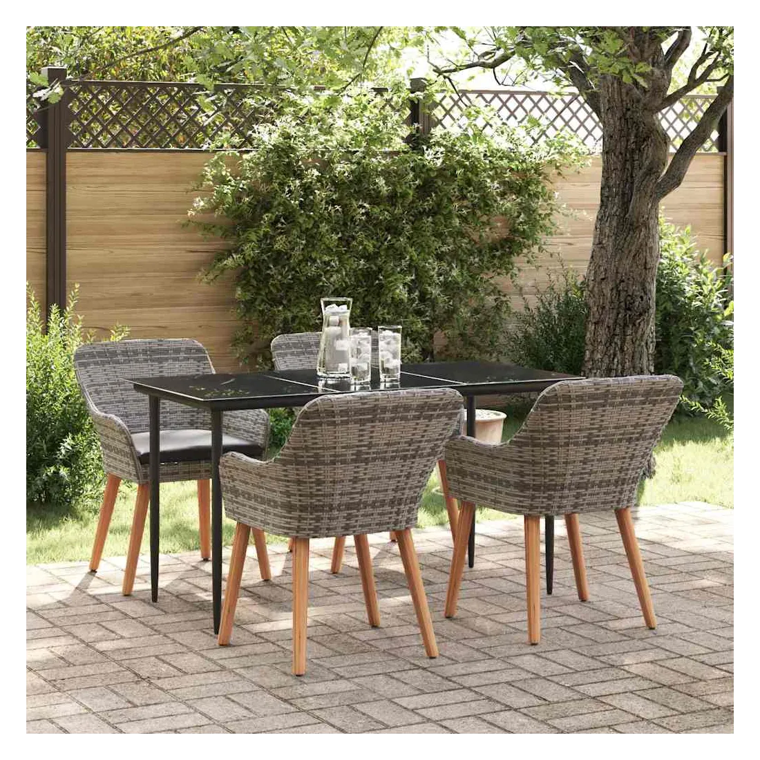 Le set de salle à manger de jardin est un super ajout à n'importe quel espace extérieur, avec un style moderne et des lignes épurées qui attirent l'œil. Réalisé pour ceux qui veulent le meilleur, cet ensemble allie perfection et style, idéal pour passer de bons moments dans votre jardin ou sur votre terrasse. Son look chic transforme votre extérieur en un endroit cool pour dîner et se relaxer. Matériau en poly rattan : Le set de salle à manger pour le jardin est fait en poly rattan, connu pour sa durabilité et son faible entretien. Ce matériau résiste aux intempéries, ce qui garantit que votre ensemble reste beau même après une utilisation extérieure. La texture du rattan apporte une touche classe à tout ensemble de jardin. Surface en verre trempé : La table est recouverte de verre trempé, ce qui offre une expérience de repas lisse. Le verre est facile à nettoyer, reste clair malgré le temps qu'il fait et ajoute une finition moderne qui complète bien le rattan. Confort total : Cet ensemble vient avec des coussins rembourrés conçus pour l'extérieur et résistants au mauvais temps, garantissant du confort même par temps difficile. Pensés pour le bien-être, les coussins s'adaptent bien aux chaises et visent à maximiser votre confort. Composants pratiques : La finition du dossier en poly rattan, avec des accoudoirs stables, crée une ambiance accueillante et ergonomique. Chaque élément a été soigneusement intégré pour rendre vos repas inoubliables. Entretien et maintenance : Conçu pour un entretien facile, il suffit de passer un coup de chiffon humide pour garder l'ensemble en top état. On vous conseille d'utiliser une housse étanche pour prolonger sa durabilité et garder son look au fil du temps.