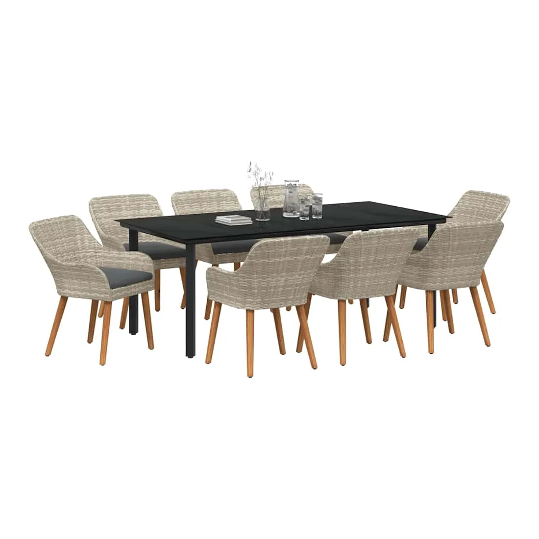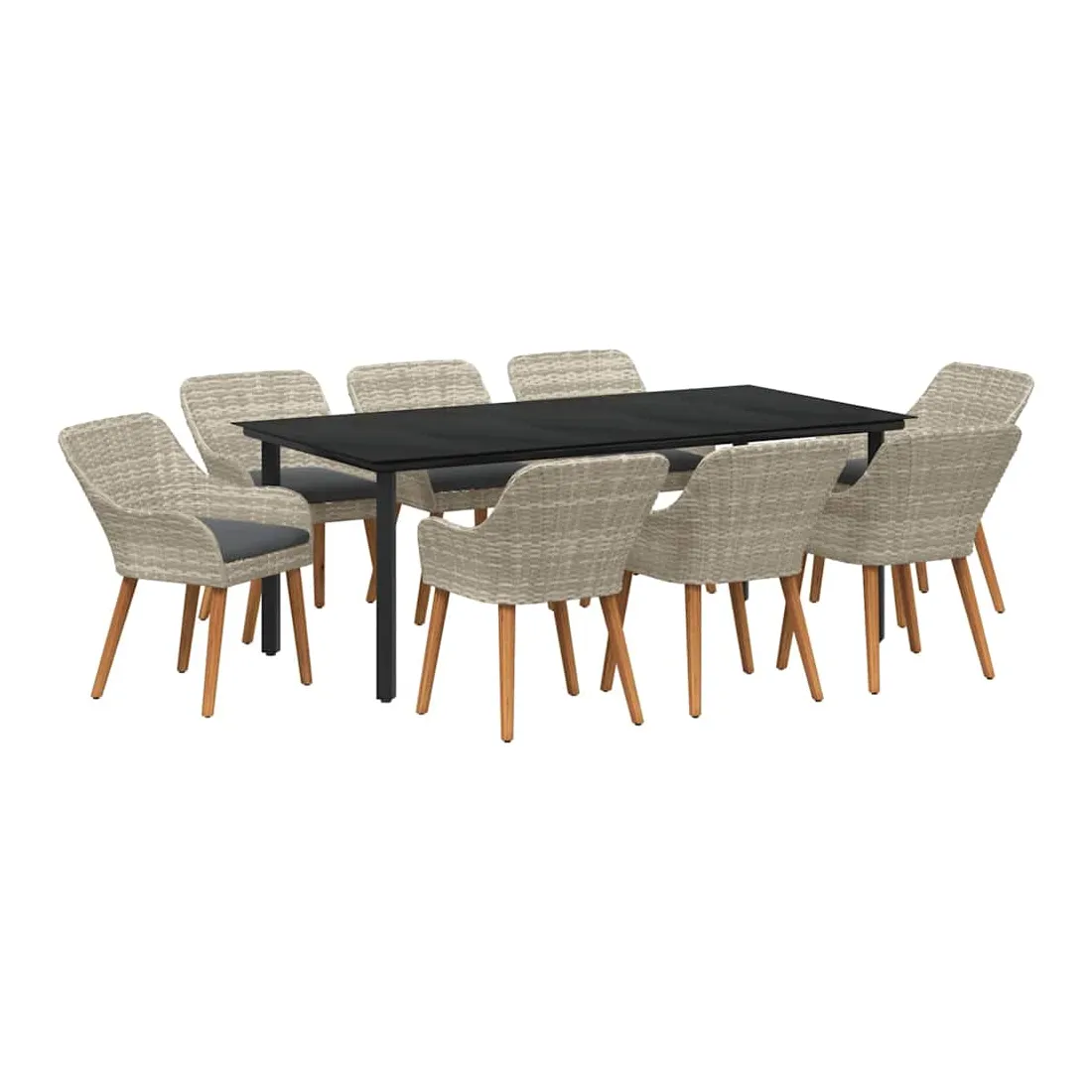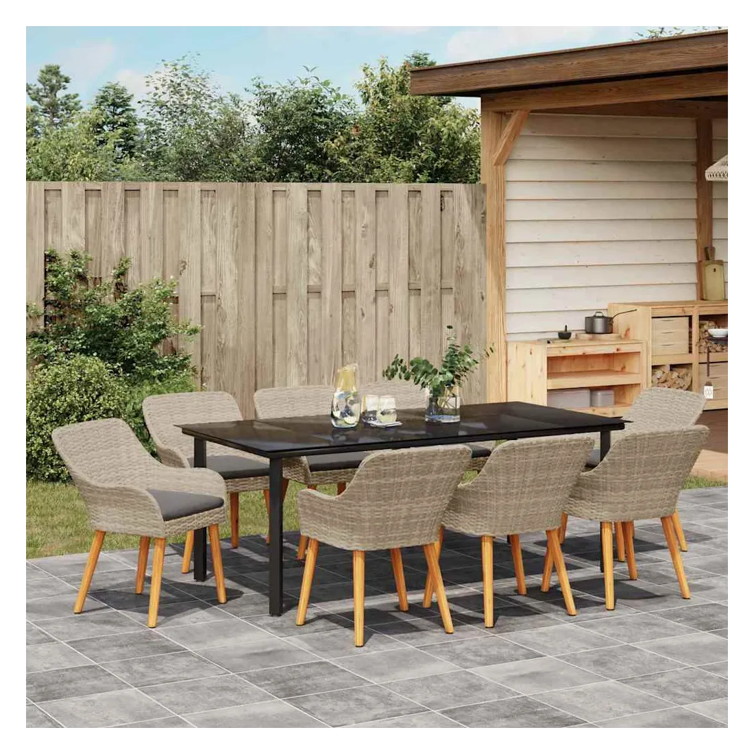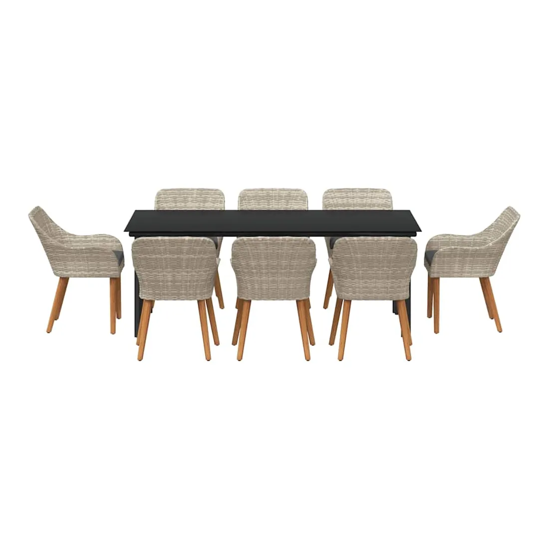 Cet ensemble de jardin moderne propose une solution à la fois actuelle et durable pour manger en extérieur, que ce soit dans le jardin ou sur la terrasse. Ses lignes épurées évoquent un design contemporain avec une large table et des chaises confortables, créant une ambiance conviviale pour vos repas en plein air. Sa finition en poly rattan gris clair s'harmonise parfaitement avec votre espace extérieur, alliant esthétique et fonctionnalité. Matériau qui tient dehors : Fabriqué avec un poly rattan résistant, cet ensemble est fait pour braver la météo, parfait pour le dehors toute l'année. Il résiste aux UV et à l'humidité, garantissant durabilité et entretien facile. Cadre en acier robuste : Fiable et solide, le cadre en acier revêtu de poudre donne une base stable, assurant sécurité durant les repas. Avec une qualité à l'esprit, il résiste bien et prolonge la vie de votre investissement. Coussins confortables : Ces coussins d'extérieur promise du confort sans compromettre leur résistance à la pluie et au soleil. Conçus pour des moments de détente, ils invitent vos invités à s'asseoir, discuter et manger tranquillement. Style moderne : Avec son look en poly rattan gris clair, cet ensemble s'intègre facilement dans tous les styles de décoration extérieure. Son design minimaliste rehausse l'ambiance sans trop charger l'espace, offrant une belle harmonie. Entretien facile : L'entretien est simple avec peu de besoin. Essuyez simplement les surfaces avec un chiffon sec pour que l'ensemble reste lumineux. Des housses de protection peuvent aussi être utilisées pour plus de soin lors de mauvais temps.