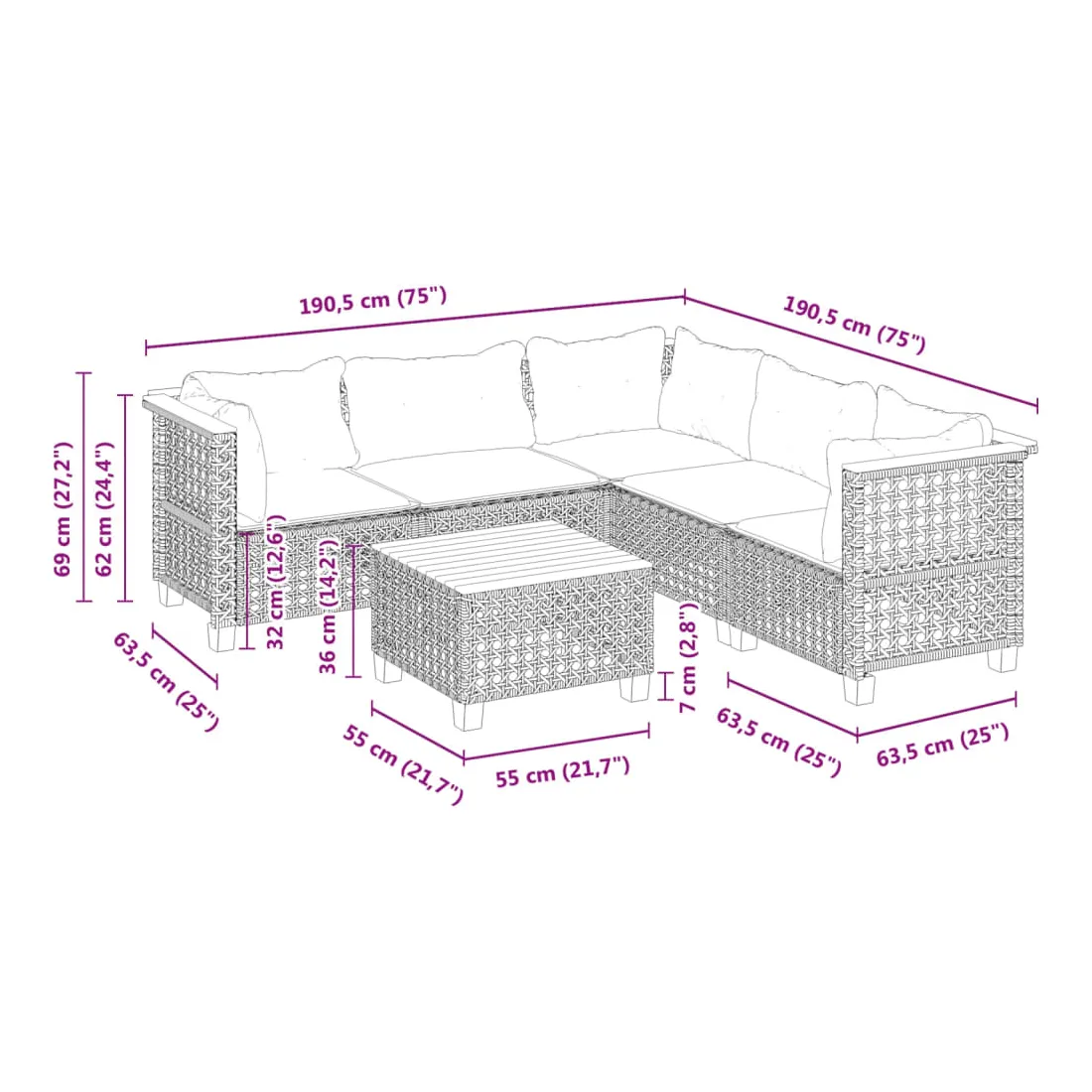 - Dimensions du coussin d’assise (angle) : 63,5 x 56,5 x 3 cm (l x P x é)