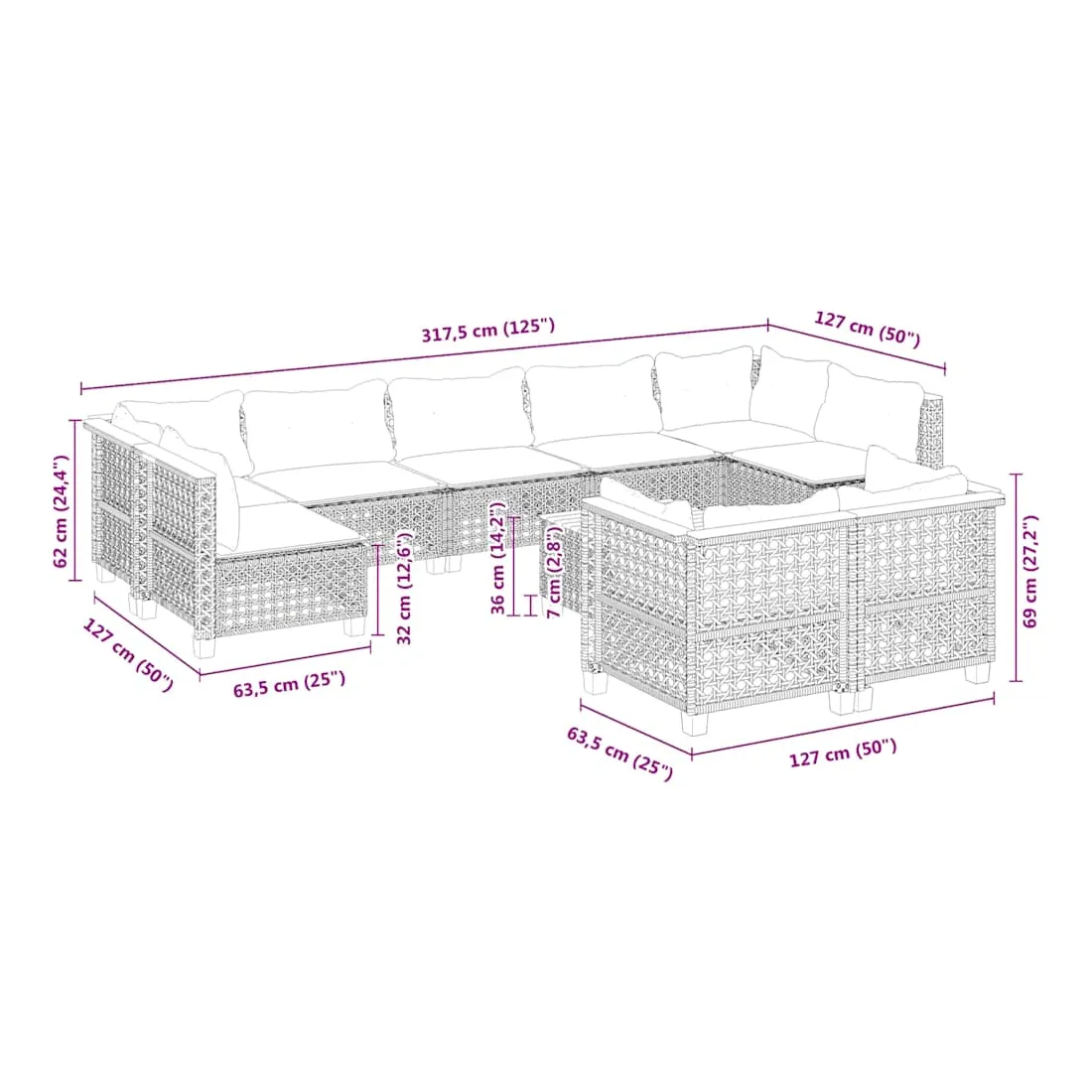 Cet ensemble de canapés de jardin est le complément parfait de votre arrière-cour, terrasse ou patio, offrant un espace confortable et accueillant pour discuter avec la famille et les amis ou simplement se détendre et profiter de l'extérieur. Matériau durable : la résine tressée, également connue sous le nom de poly rotin, est un matériau synthétique solide et nécessitant peu d'entretien qui ressemble au rotin naturel. Elle est légère, facile à nettoyer et couramment utilisée pour les meubles d'extérieur en raison de sa durabilité et de ses propriétés de résistance aux intempéries.Expérience d'assise confortable : ce mobilier d'extérieur, doté de coussins épais, offre une expérience d'assise confortable.Housse amovible et lavable : ces coussins de siège sont dotés de housses amovibles pour un lavage et un entretien faciles.Dessus stable et facile à nettoyer : cette table de jardin a un dessus en bois d'acacia robuste, durable et facile à nettoyer avec un chiffon humide.Conception modulaire : cet ensemble de meubles d'extérieur a une conception modulaire, ce qui le rend complètement flexible et facile à déplacer, afin que vous puissiez créer un agencement de meubles d'extérieur personnalisé. Bon à savoir :Pour que vos meubles d'extérieur restent beaux, nous vous recommandons de les protéger avec une housse imperméable.