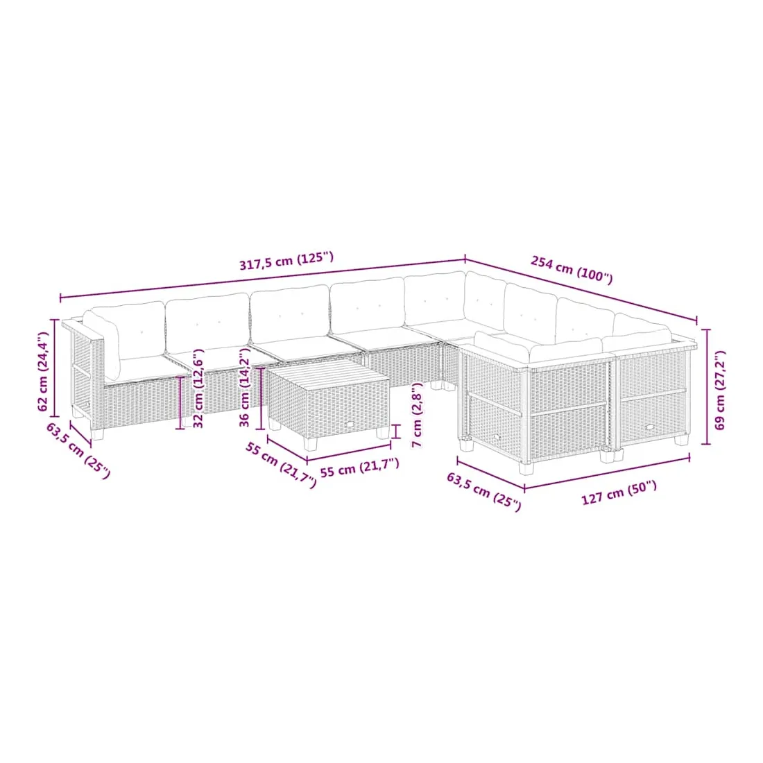 Cet ensemble de canapés de jardin est le complément parfait de votre arrière-cour, terrasse ou patio, offrant un espace confortable et accueillant pour discuter avec la famille et les amis ou simplement se détendre et profiter de l'extérieur. Matériau durable : la résine tressée, également connue sous le nom de poly rotin, est un matériau synthétique solide et nécessitant peu d'entretien qui ressemble au rotin naturel. Elle est légère, facile à nettoyer et couramment utilisée pour les meubles d'extérieur en raison de sa durabilité et de ses propriétés de résistance aux intempéries.Expérience d'assise confortable : ce mobilier d'extérieur, doté de coussins épais, offre une expérience d'assise confortable.Housse amovible et lavable : ces coussins de siège sont dotés de housses amovibles pour un lavage et un entretien faciles.Dessus stable et facile à nettoyer : cette table de jardin a un dessus en bois d'acacia robuste, durable et facile à nettoyer avec un chiffon humide.Conception modulaire : cet ensemble de meubles d'extérieur a une conception modulaire, ce qui le rend complètement flexible et facile à déplacer, afin que vous puissiez créer un agencement de meubles d'extérieur personnalisé. Bon à savoir :Pour que vos meubles d'extérieur restent beaux, nous vous recommandons de les protéger avec une housse imperméable.