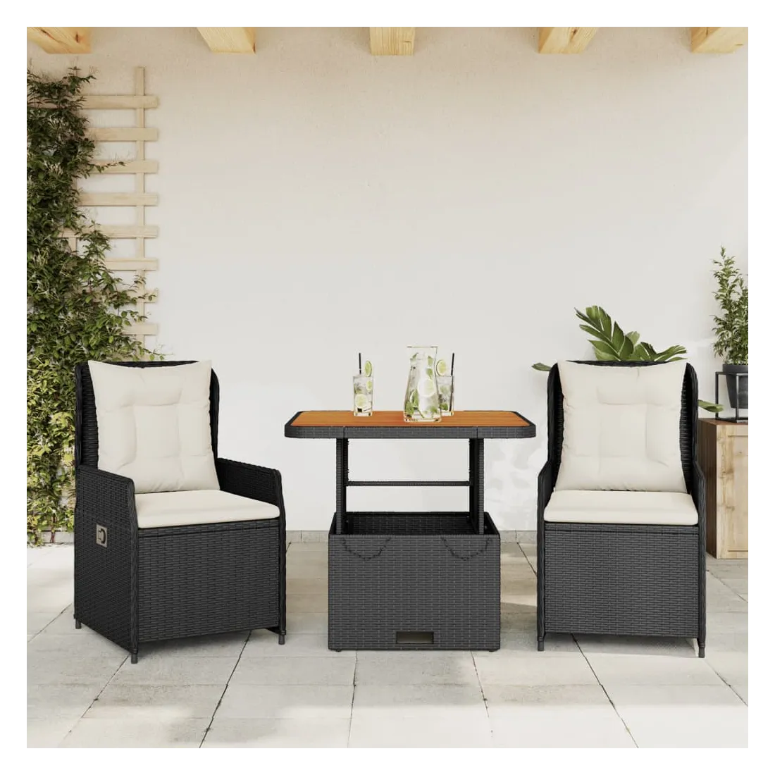 Savourez un café ou discutez avec votre famille et vos amis dans le jardin, l'arrière-cour ou sur le balcon avec cet ensemble de bistro confortable ! Matériau durable : la résine tressée, également connue sous le nom de poly rotin, est un matériau synthétique solide et nécessitant peu d'entretien qui ressemble au rotin naturel. Il est léger, facile à nettoyer et couramment utilisé pour les meubles d'extérieur en raison de sa durabilité et de ses propriétés de résistance aux intempéries.Dossier réglable : ce siège de jardin est doté d'une poignée. Vous pouvez régler le dossier dans n'importe quelle position en tirant sur la poignée et le remettre rapidement dans sa position initiale.Housse amovible et lavable : le coussin de siège est doté d'une housse amovible pour un lavage et un entretien faciles.Dessus de table réglable : le dessus de table peut être soulevé pour rendre la table plus haute, ce qui transforme la table d'extérieur d'une table basse à une table de salle à manger. Elle est parfaite pour recevoir des invités ou prendre des repas à l'extérieur.Dessus stable et facile à nettoyer : cette table de jardin a un dessus en bois d'acacia robuste, durable et facile à nettoyer avec un chiffon humide. Bon à savoir :Pour que vos meubles d'extérieur restent beaux, nous vous recommandons de les protéger avec une housse imperméable.