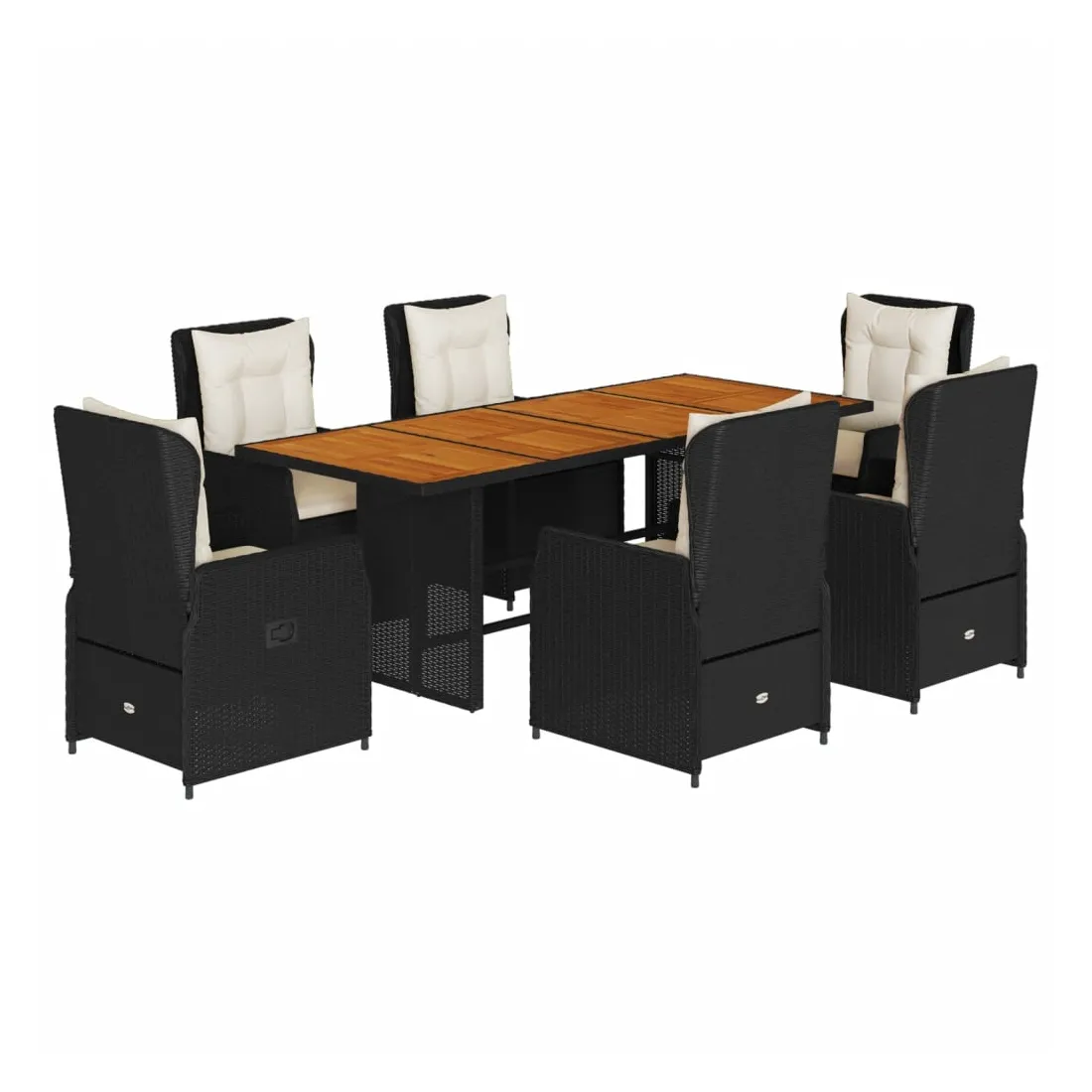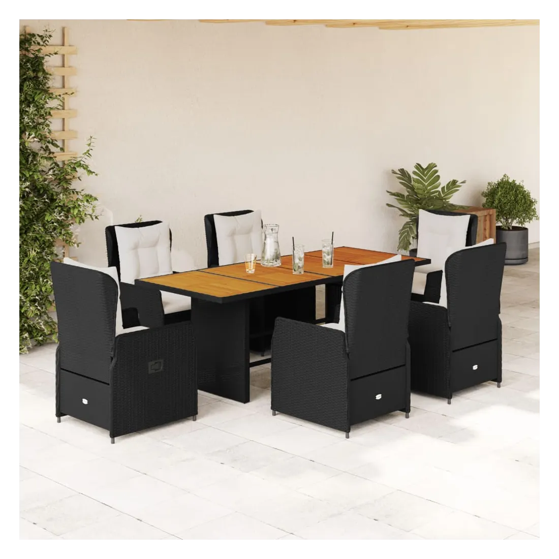 Cet ensemble de salle à manger de jardin est un excellent choix pour les repas en plein air ou pour vous détendre dans le jardin, dans l'arrière-cour ou sur la terrasse. Matériau durable : la résine tressée, également connue sous le nom de poly rotin, est un matériau synthétique solide et nécessitant peu d'entretien qui ressemble au rotin naturel. Il est léger, facile à nettoyer et couramment utilisé pour les meubles d'extérieur en raison de sa durabilité et de ses propriétés de résistance aux intempéries.Dossier réglable : ce siège de jardin est doté d'une poignée. Vous pouvez régler le dossier dans n'importe quelle position en tirant sur la poignée et le remettre rapidement dans sa position initiale.Expérience d'assise confortable : ce mobilier d'extérieur, doté de coussins épais, offre une expérience d'assise confortable.Housse amovible et lavable : le coussin de siège est doté d'une housse amovible pour un lavage et un entretien faciles.Dessus stable et facile à nettoyer : cette table de jardin a un dessus en bois d'acacia robuste, durable et facile à nettoyer avec un chiffon humide. Bon à savoir :Pour que vos meubles d'extérieur restent beaux, nous vous recommandons de les protéger avec une housse imperméable.