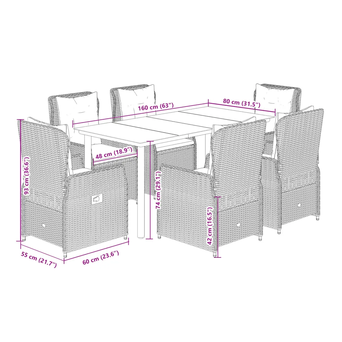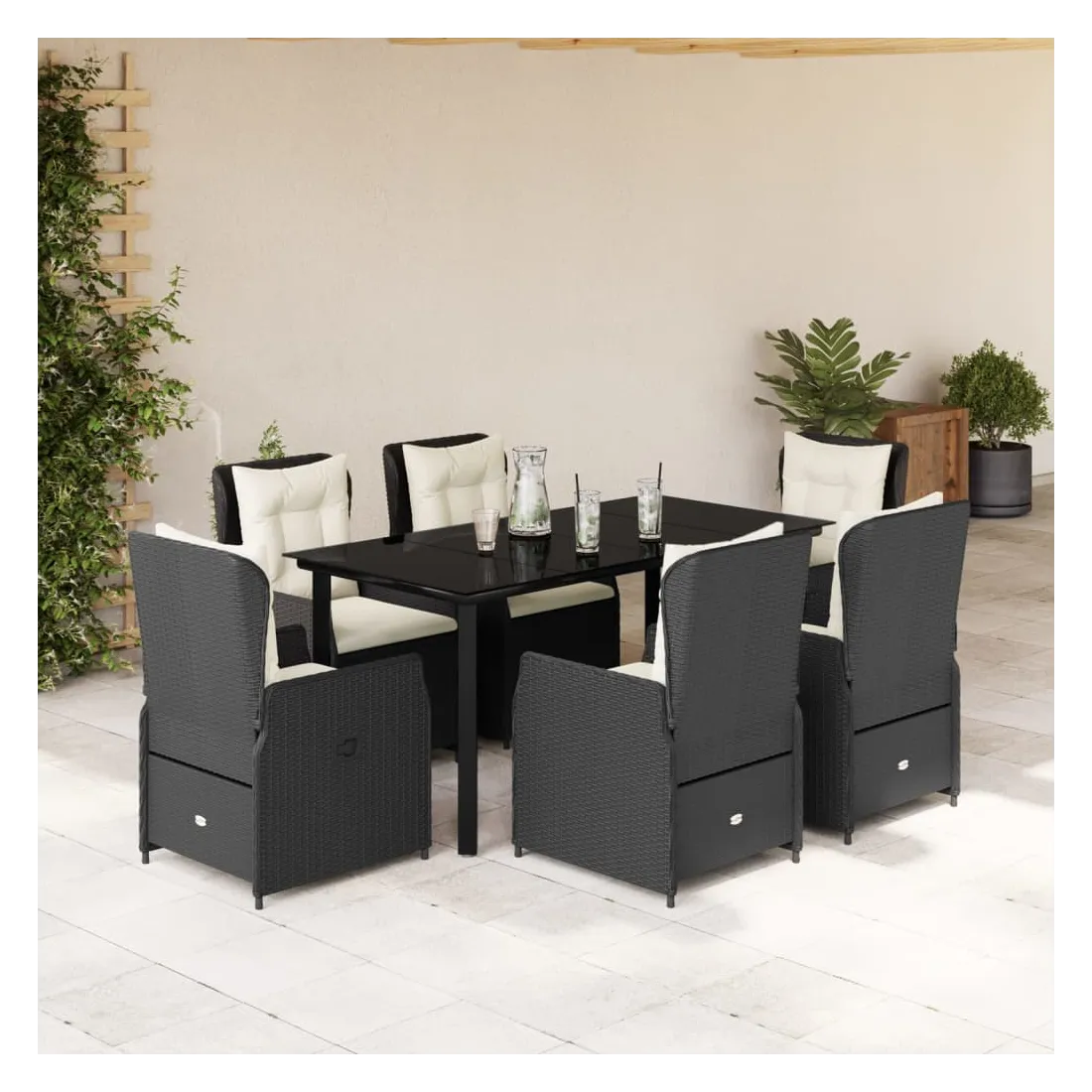 Cet ensemble de salle à manger de jardin est un excellent choix pour les repas en plein air ou pour vous détendre dans le jardin, dans l'arrière-cour ou sur la terrasse. Matériau durable : la résine tressée, également connue sous le nom de poly rotin, est un matériau synthétique solide et nécessitant peu d'entretien qui ressemble au rotin naturel. Il est léger, facile à nettoyer et couramment utilisé pour les meubles d'extérieur en raison de sa durabilité et de ses propriétés de résistance aux intempéries.Dossier réglable : ce siège de jardin est doté d'une poignée. Vous pouvez régler le dossier dans n'importe quelle position en tirant sur la poignée et le remettre rapidement dans sa position initiale.Expérience d'assise confortable : ce mobilier d'extérieur, doté de coussins épais, offre une expérience d'assise confortable.Housse amovible et lavable : le coussin de siège est doté d'une housse amovible pour un lavage et un entretien faciles.Dessus en verre : le dessus de la table d'extérieur est fabriqué en verre trempé solide et durable, ce qui le rend facile à nettoyer avec un chiffon humide et ajoute une touche d'élégance à votre espace extérieur. Bon à savoir :Pour que vos meubles d'extérieur restent beaux, nous vous recommandons de les protéger avec une housse imperméable.