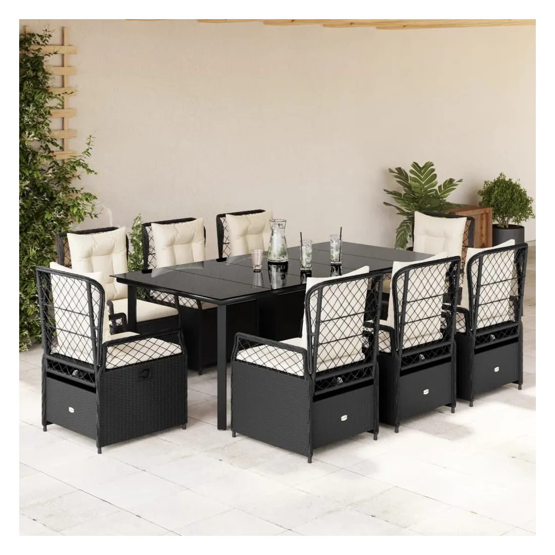 Cet ensemble de salle à manger de jardin est un excellent choix pour les repas en plein air ou pour vous détendre dans le jardin, dans l'arrière-cour ou sur la terrasse. Matériau durable : la résine tressée, également connue sous le nom de poly rotin, est un matériau synthétique solide et nécessitant peu d'entretien qui ressemble au rotin naturel. Il est léger, facile à nettoyer et couramment utilisé pour les meubles d'extérieur en raison de sa durabilité et de ses propriétés de résistance aux intempéries.Dossier réglable : ce siège de jardin est doté d'une poignée. Vous pouvez régler le dossier dans n'importe quelle position en tirant sur la poignée et le remettre rapidement dans sa position initiale.Expérience d'assise confortable : ce mobilier d'extérieur, doté de coussins épais, offre une expérience d'assise confortable.Housse amovible et lavable : le coussin de siège est doté d'une housse amovible pour un lavage et un entretien faciles.Dessus en verre : le dessus de la table d'extérieur est fabriqué en verre trempé solide et durable, ce qui le rend facile à nettoyer avec un chiffon humide et ajoute une touche d'élégance à votre espace extérieur. Bon à savoir :Pour que vos meubles d'extérieur restent beaux, nous vous recommandons de les protéger avec une housse imperméable.
