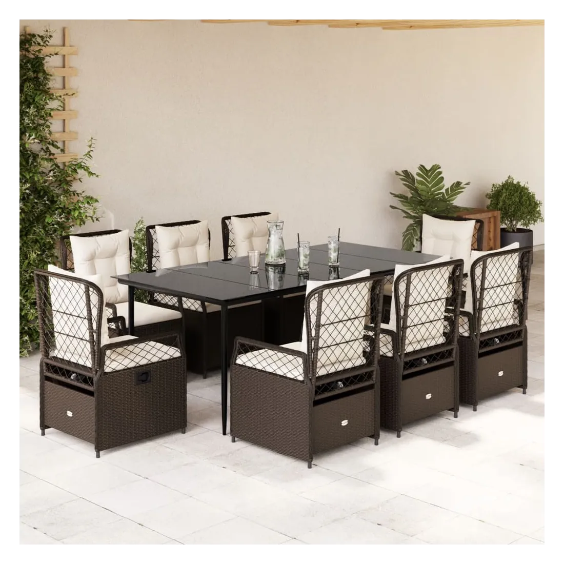 Cet ensemble de salle à manger de jardin est un excellent choix pour les repas en plein air ou pour vous détendre dans le jardin, dans l'arrière-cour ou sur la terrasse. Matériau durable : la résine tressée, également connue sous le nom de poly rotin, est un matériau synthétique solide et nécessitant peu d'entretien qui ressemble au rotin naturel. Il est léger, facile à nettoyer et couramment utilisé pour les meubles d'extérieur en raison de sa durabilité et de ses propriétés de résistance aux intempéries.Dossier réglable : ce siège de jardin est doté d'une poignée. Vous pouvez régler le dossier dans n'importe quelle position en tirant sur la poignée et le remettre rapidement dans sa position initiale.Expérience d'assise confortable : ce mobilier d'extérieur, doté de coussins épais, offre une expérience d'assise confortable.Housse amovible et lavable : le coussin de siège est doté d'une housse amovible pour un lavage et un entretien faciles.Dessus en verre : le dessus de la table d'extérieur est fabriqué en verre trempé solide et durable, ce qui le rend facile à nettoyer avec un chiffon humide et ajoute une touche d'élégance à votre espace extérieur. Bon à savoir :Pour que vos meubles d'extérieur restent beaux, nous vous recommandons de les protéger avec une housse imperméable.