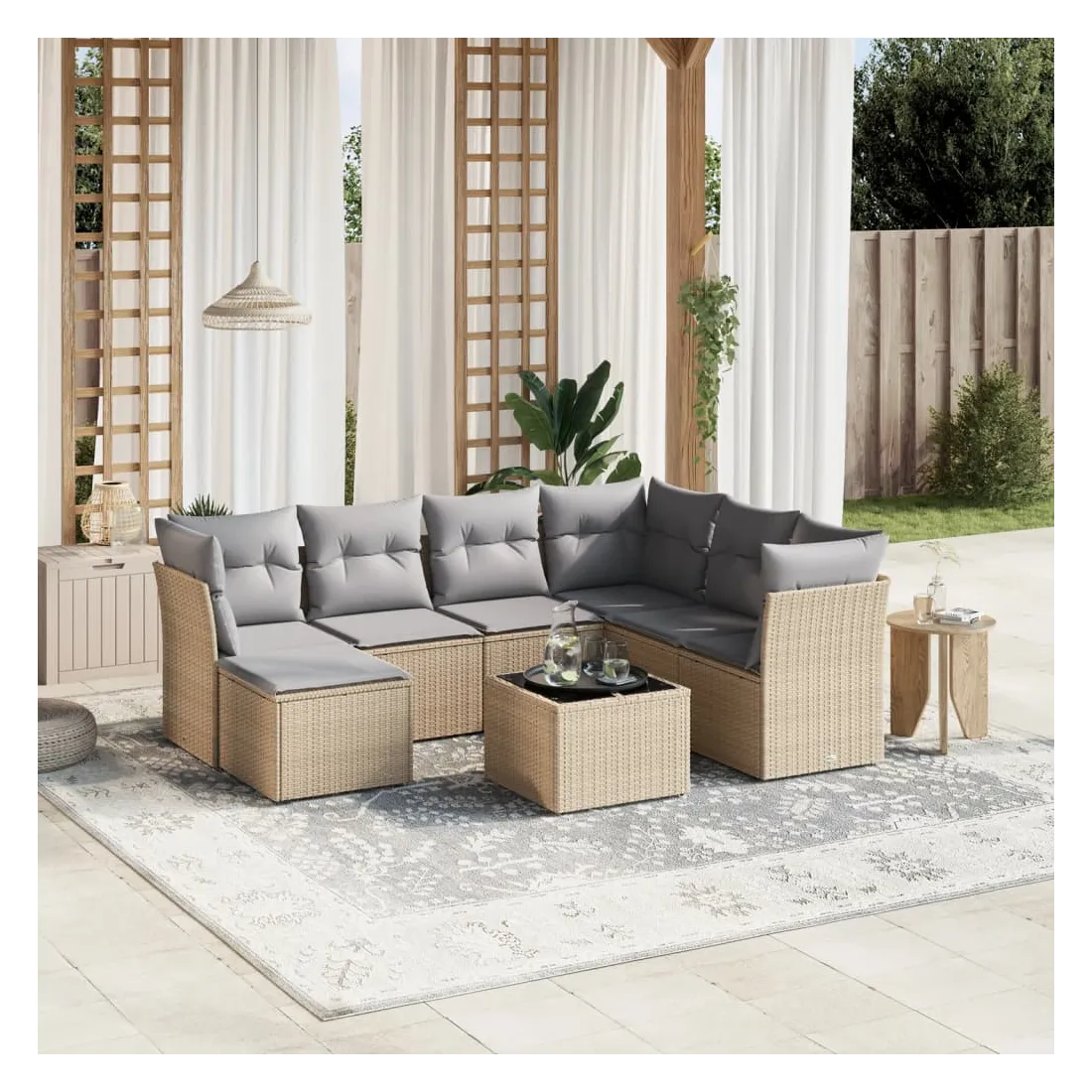 Cet ensemble de canapés de jardin est le complément parfait de votre arrière-cour, terrasse ou patio, offrant un espace confortable et accueillant pour discuter avec la famille et les amis ou simplement se détendre et profiter de l'extérieur. Matériau durable : la résine tressée, également connue sous le nom de poly rotin, est un matériau synthétique solide et nécessitant peu d'entretien qui ressemble au rotin naturel. Il est léger, facile à nettoyer et couramment utilisé pour les meubles d'extérieur en raison de sa durabilité et de ses propriétés de résistance aux intempéries.Dessus en verre : le dessus de la table d'extérieur est fabriqué en verre trempé solide et durable, ce qui le rend facile à nettoyer avec un chiffon humide et ajoute une touche d'élégance à votre espace extérieur.Housse amovible et lavable : ces coussins de siège sont dotés de housses amovibles pour un lavage et un entretien faciles.Cadre robuste et stable : le cadre en acier enduit de poudre assure la solidité et la stabilité du meuble de jardin pour une utilisation quotidienne à l'extérieur.Conception modulaire : cet ensemble de meubles d'extérieur a une conception modulaire, ce qui le rend complètement flexible et facile à déplacer, afin que vous puissiez créer un agencement de meubles d'extérieur personnalisé. Bon à savoir :Pour que vos meubles d'extérieur restent beaux, nous vous recommandons de les protéger avec une housse imperméable.
