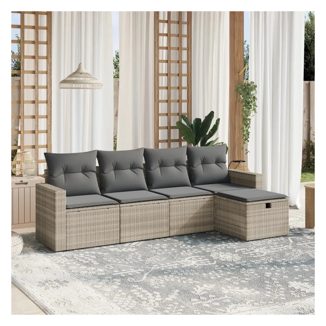 Cet ensemble de canapés de jardin est le complément parfait de votre arrière-cour, terrasse ou patio, offrant un espace confortable et accueillant pour discuter avec la famille et les amis ou simplement se détendre et profiter de l'extérieur. Matériau durable : la résine tressée, également connue sous le nom de poly rotin, est un matériau synthétique solide et nécessitant peu d'entretien qui ressemble au rotin naturel. Il est léger, facile à nettoyer et couramment utilisé pour les meubles d'extérieur en raison de sa durabilité et de ses propriétés de résistance aux intempéries.Expérience d'assise confortable : ce mobilier d'extérieur, doté de coussins épais, offre une expérience d'assise confortable.Housse amovible et lavable : ces coussins de siège sont dotés de housses amovibles pour un lavage et un entretien faciles.Cadre robuste et stable : le cadre en acier enduit de poudre assure la solidité et la stabilité du meuble de jardin pour une utilisation quotidienne à l'extérieur.Conception modulaire : cet ensemble de meubles d'extérieur a une conception modulaire, ce qui le rend complètement flexible et facile à déplacer, afin que vous puissiez créer un agencement de meubles d'extérieur personnalisé. Bon à savoir :Pour que vos meubles d'extérieur restent beaux, nous vous recommandons de les protéger avec une housse imperméable.